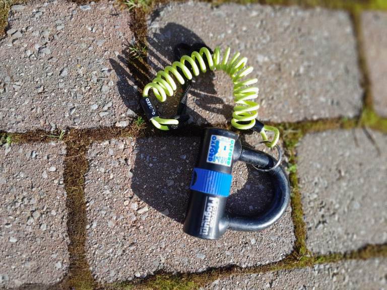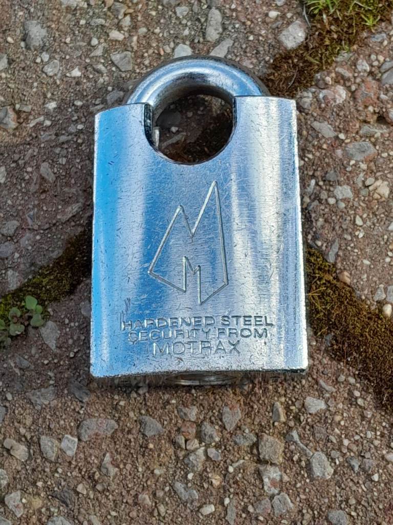 Heavy duty motor bike chain with sleeve and Motrax lock, complete with two keys.
