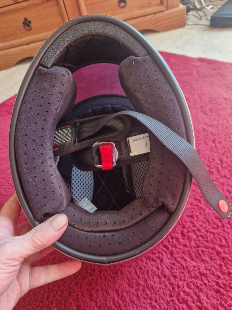 This helmet has only been worn twice and is in excellent condition. The interior is spotless, and it’s been carefully stored. The outside has a couple of tiny cosmetic marks from other helmets bumping against it on a rack, (see photos) – never dropped, no crashes, no damage.