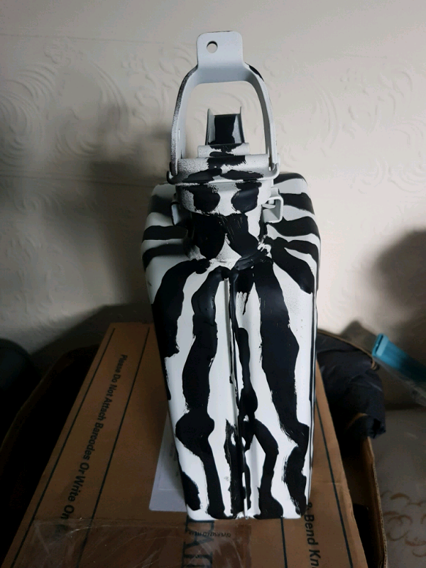 The zebra pattern was intended to be a change from the regular army green finish of jerrycans. I think it looks unique. It should fit readily to Touratech/BMW aluminium pannier boxes, giving you the reassurance of a supply of reserve fuel if you should need it.