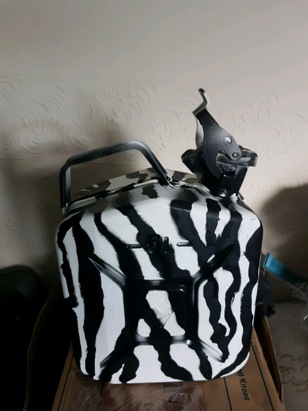 A novel 5 litre steel jerrycan, like a miniature version of the full sized 20 litre army cans. Painted in zebra pattern. It is new and has never had fuel in it.