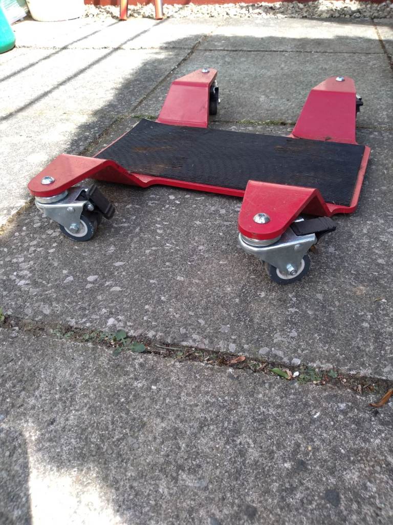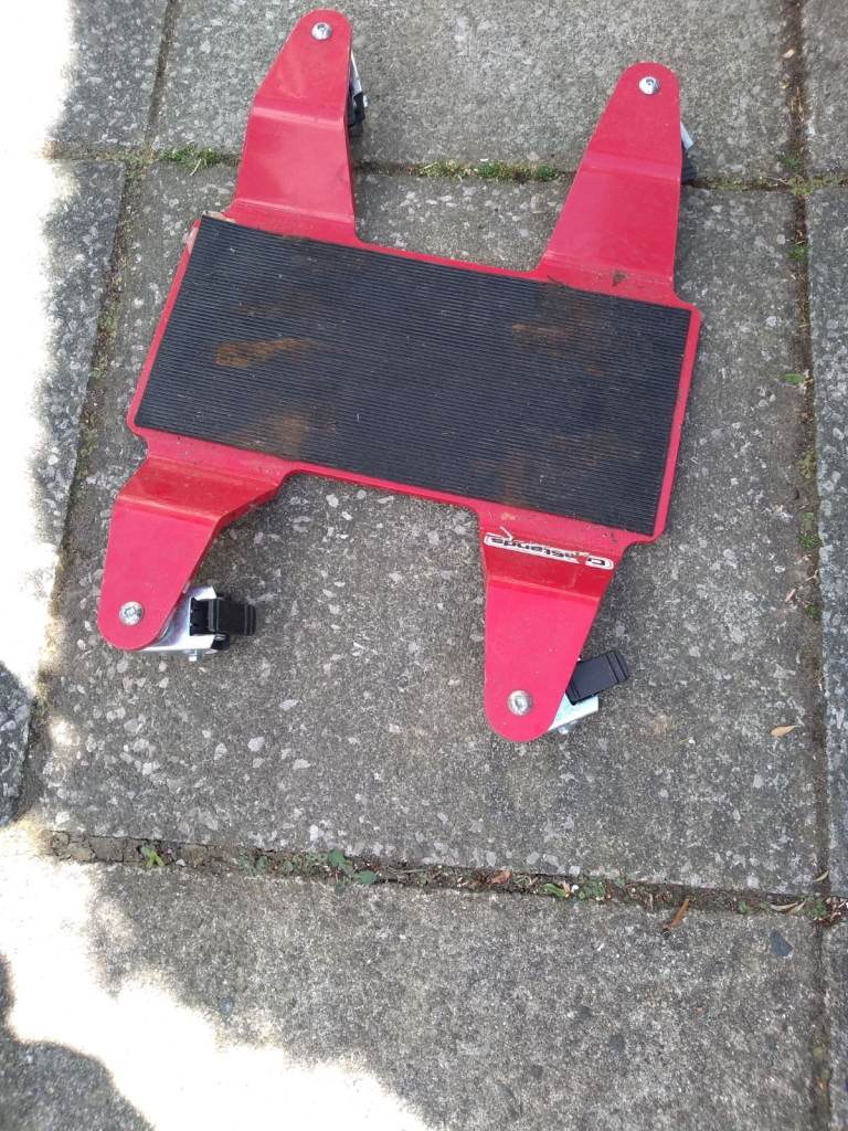 ConStands Mover II, max load capacity 320 kg, red. Support surface 45 x 23 cm, 4 x double castors with brakes, anti-slip rubberised mat. For easier moving of motorbikes and scooters with centre stand. Collection only.