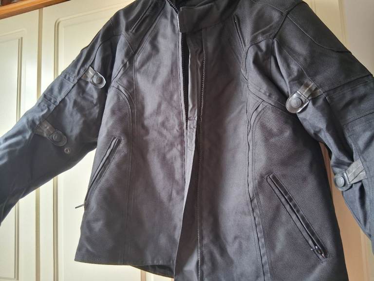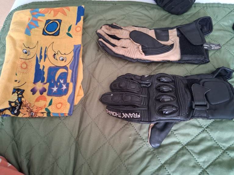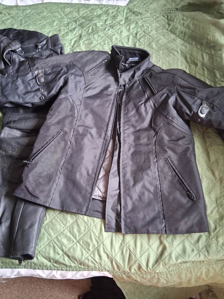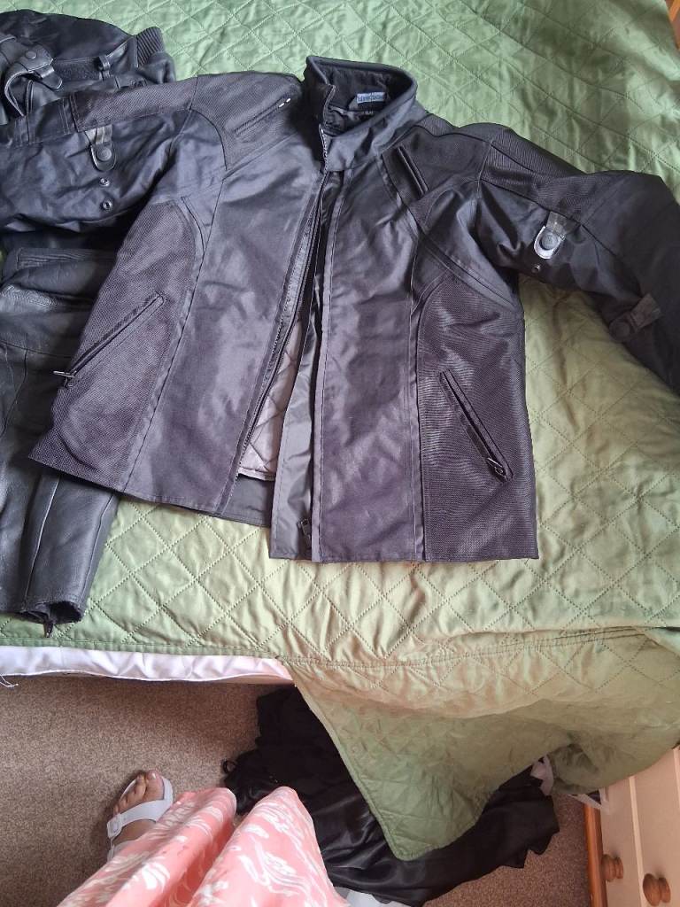 Gortex style material fully padded and lined jacket. Leather bike trousers fully lined and leather armoured gloves. Gloves med. Jkt size 14,trousers size 10 to 12 . As new