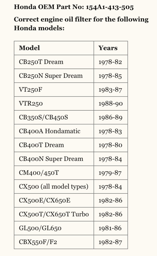 Hamana motorcycle oil filter 154a1-413-005 for Honda CB250, possibly others. Unused - bought for project bike that never completed. The part number - 154a1-413-005 - seems to be a Honda number. This shot above comes from a site listing more bikes compatible with Honda's 154a1-413-005 - honda-classics dot co dot uk