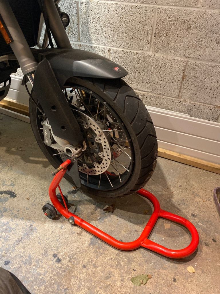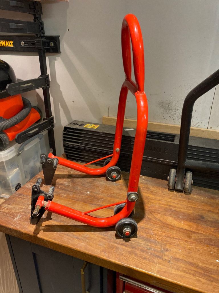 This is one of two paddock stands I have. I’ve used this for the front forks but can easily be used for the rear. I’ve moved onto old man centre stand bike now so not really needed if someone else wants to make use of.