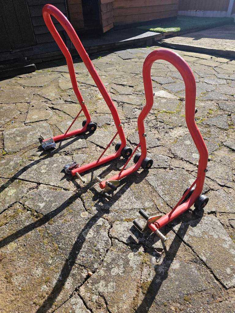 Ideal for supporting road-, and off road bikes during transportation and long term storage. They fit between the front tyre and mudguard and help to prevent over compression of forks and fork seals.