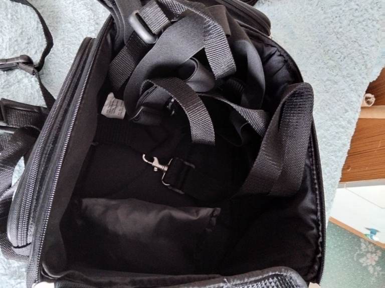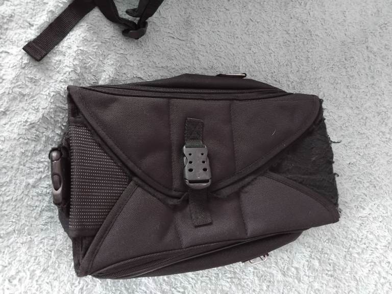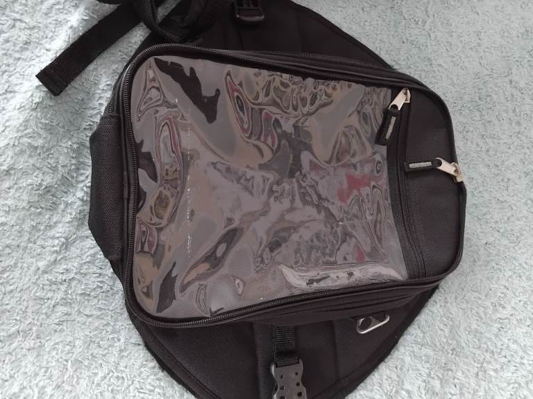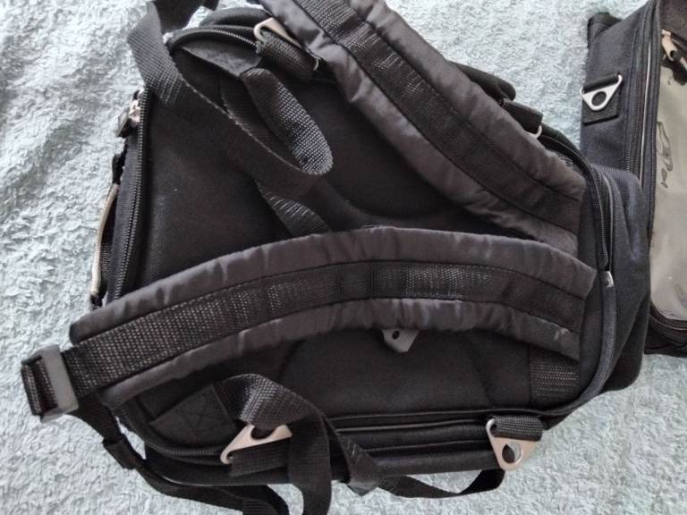 Separates in to two bags. Smaller one has magnetic tank grip. Larger bag converts to back pack. Lots of storage pockets.raincover in corporated. All zips work. Complete with all straps. Excellent condition.