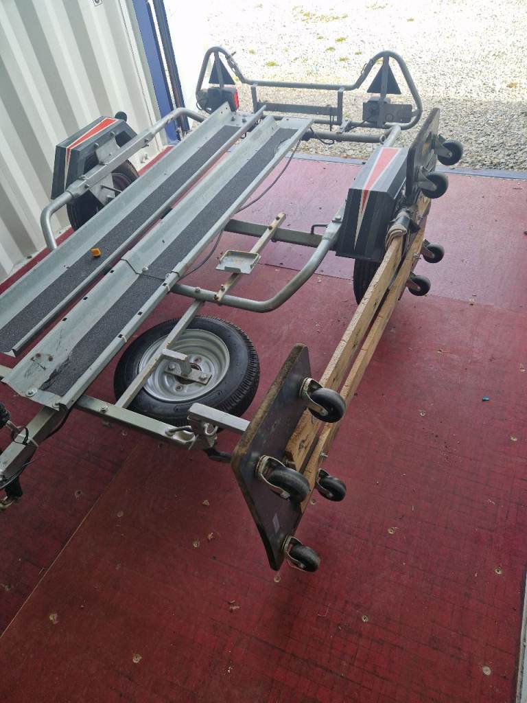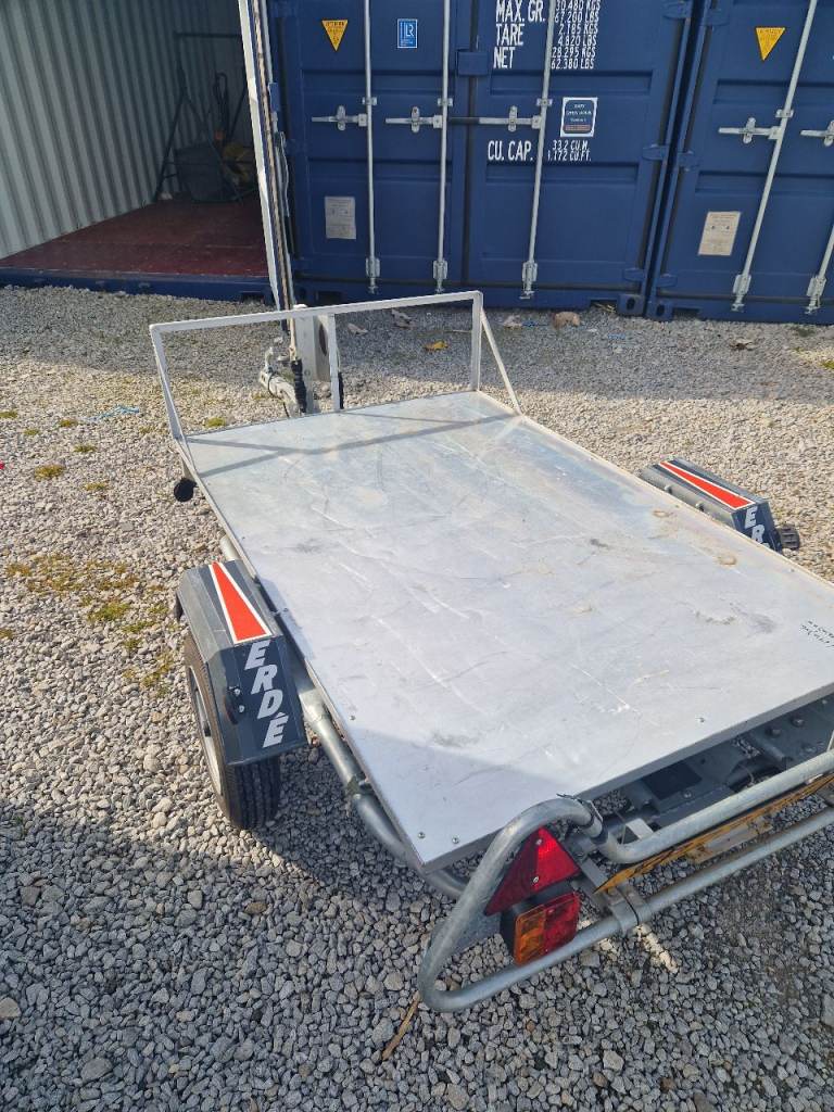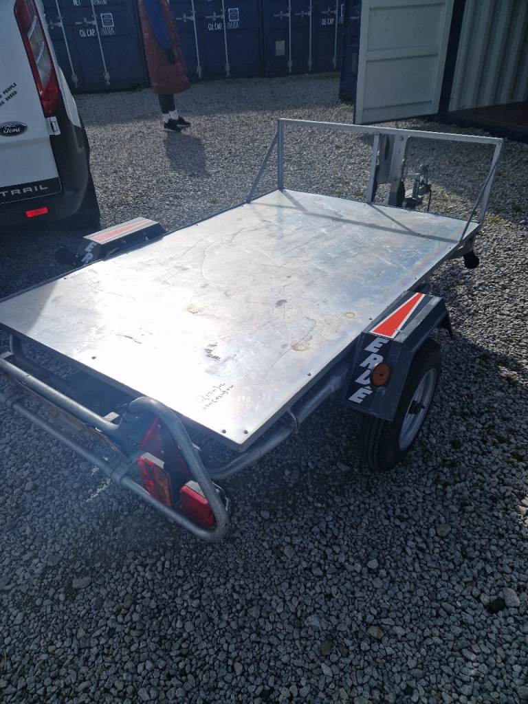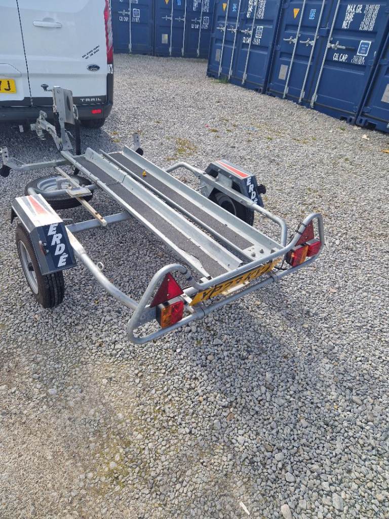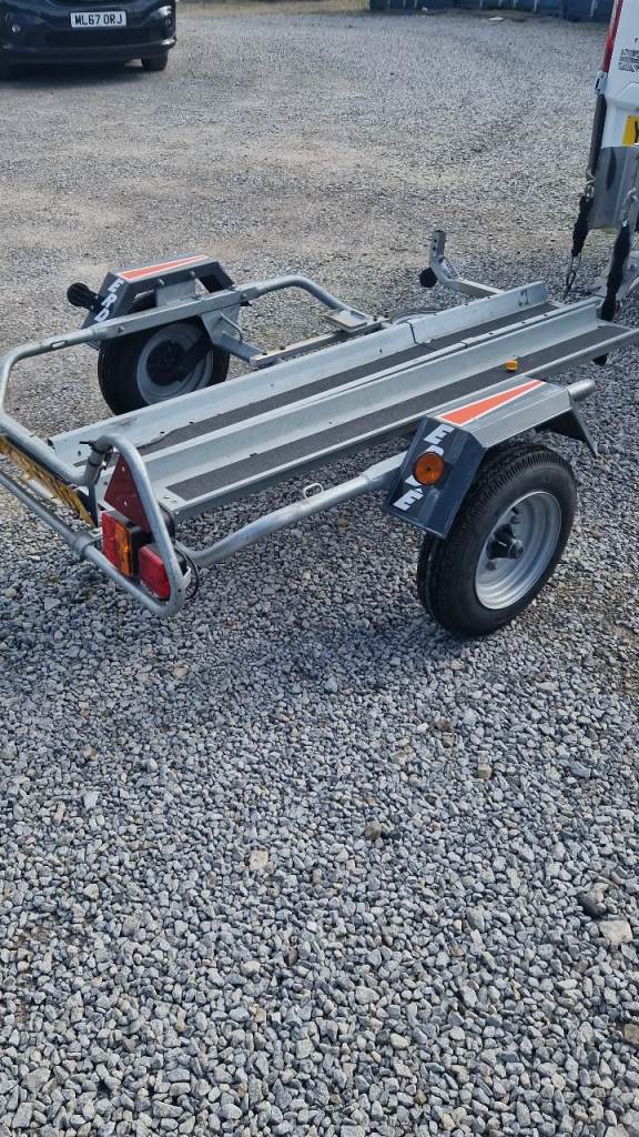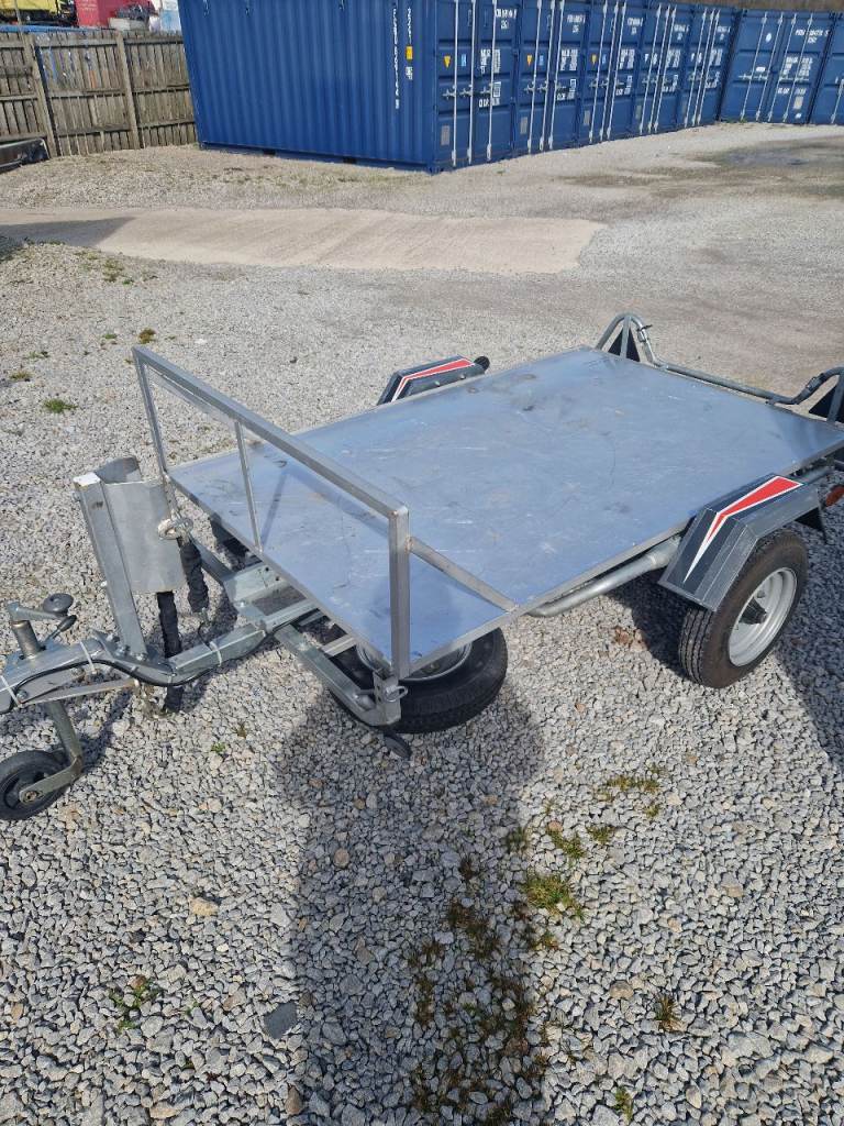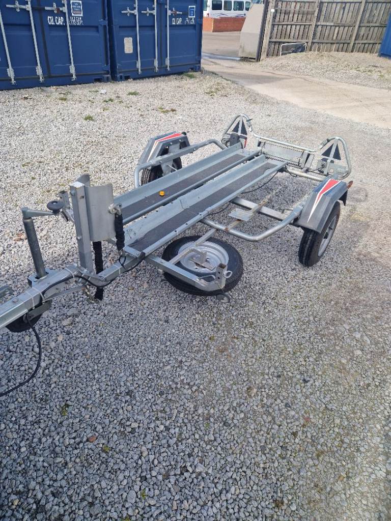 Bike trailer very good condition LED lights all working nearly new tyres also has detachable flat bed and skate trolley to move trailer about stood up on its side, had Yamaha Tracer 700 on it no problems.