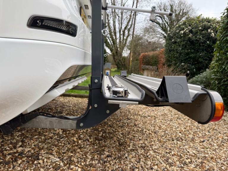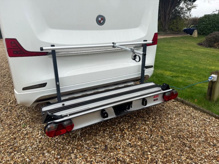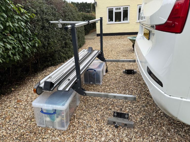 Apoyo Motorbike carrier. High capacity heavy duty rack designed for Motorhomes. Supports up to 150 kgs. Mounted directly to chassis providing stability for 125cc scooters. Ramp for easy loading. Foldable arm. Excellent condition. Price new £1500 Sale £800. Buyer collects.