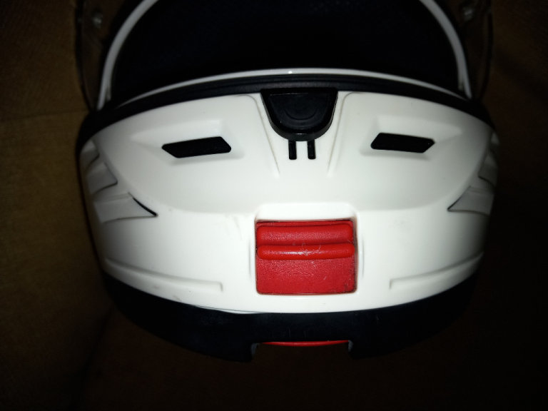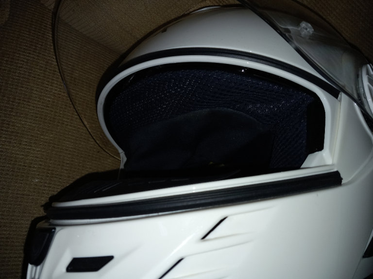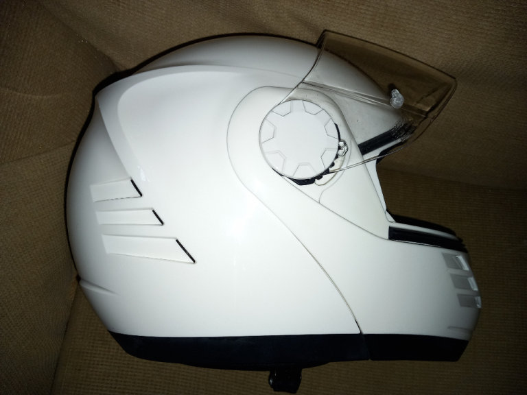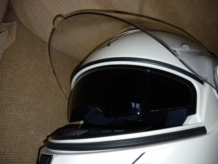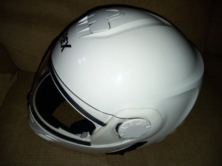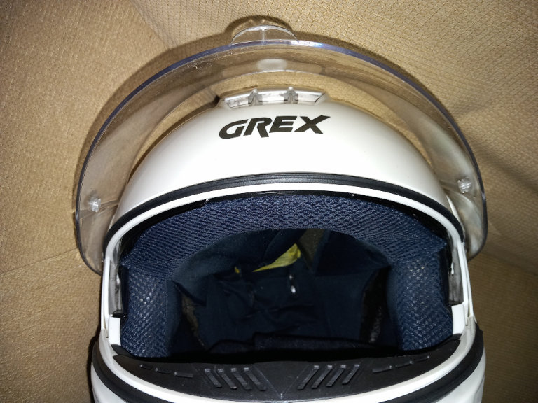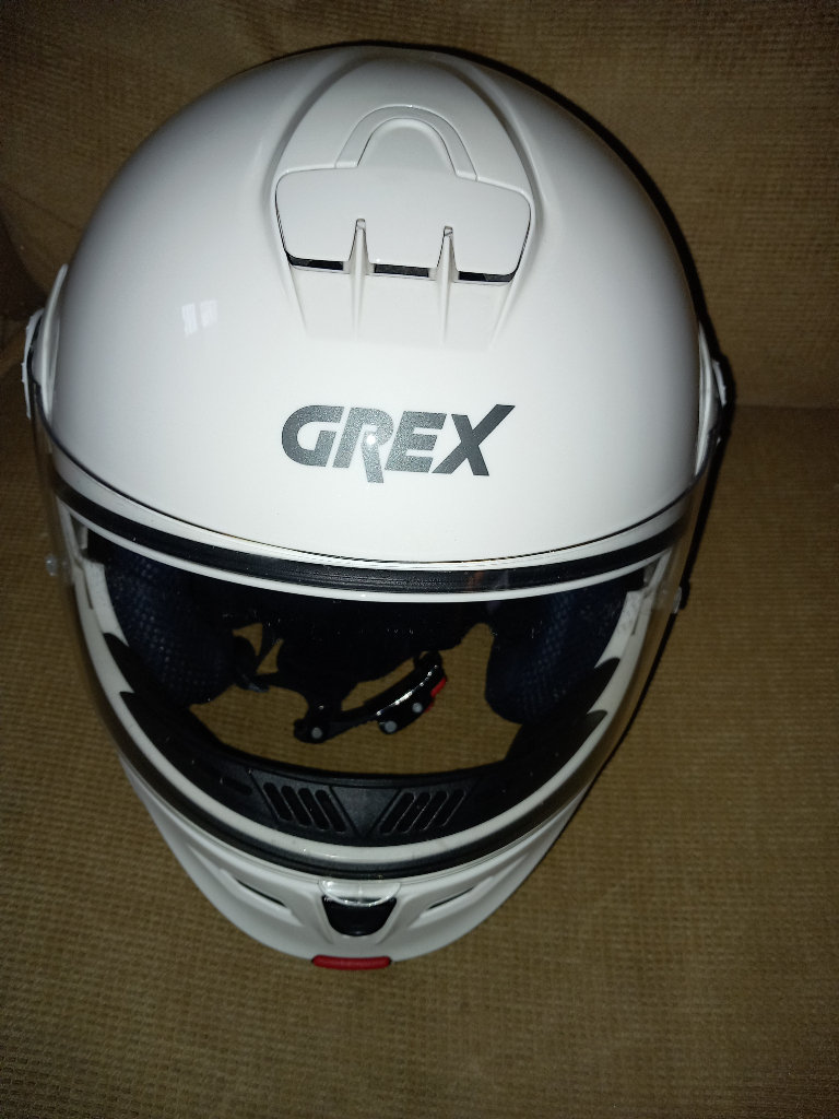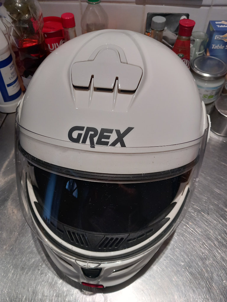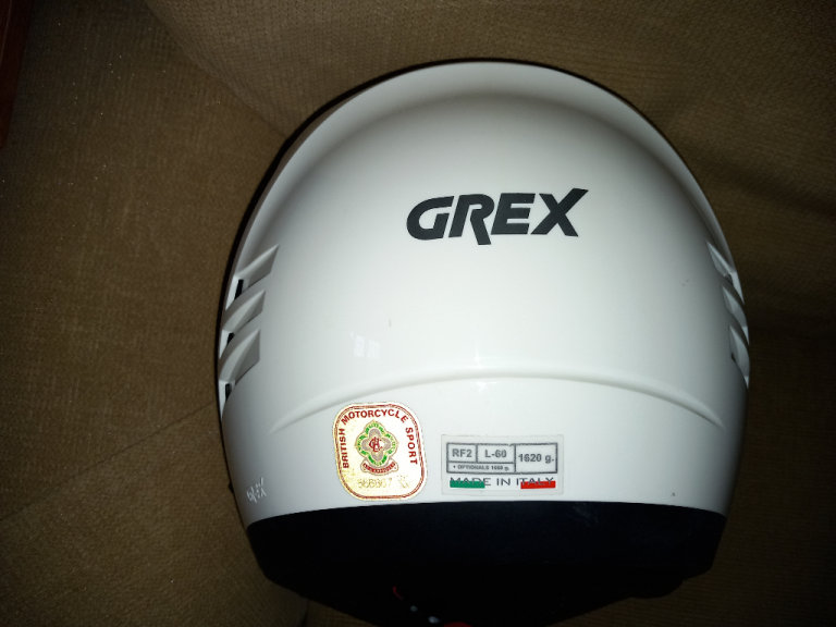 The motorcycle helmet by Grex, whits with visor and pull-down sun visor condition is good with no scratches or marks, little used sizes and specs are RF2, L-60, 1620 G