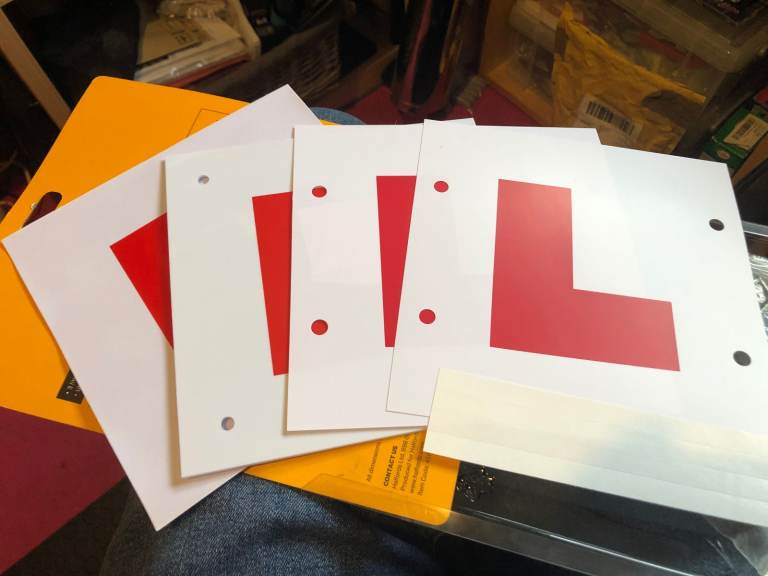 Motorcycle “L” Plates Kit, comprising one rigid, two flimsy and one self-adhesive plate complete with fork brackets, magnetic strips and fixings, never used so in as new condition, free to uplift, collection only from Methven
