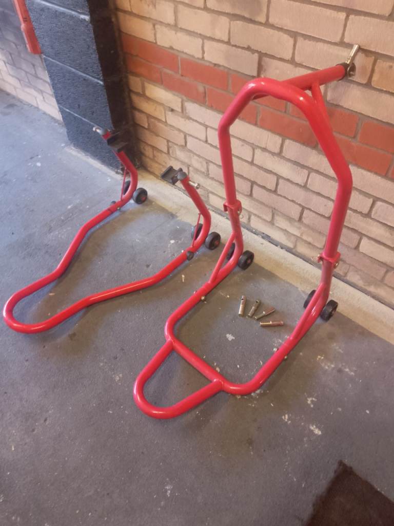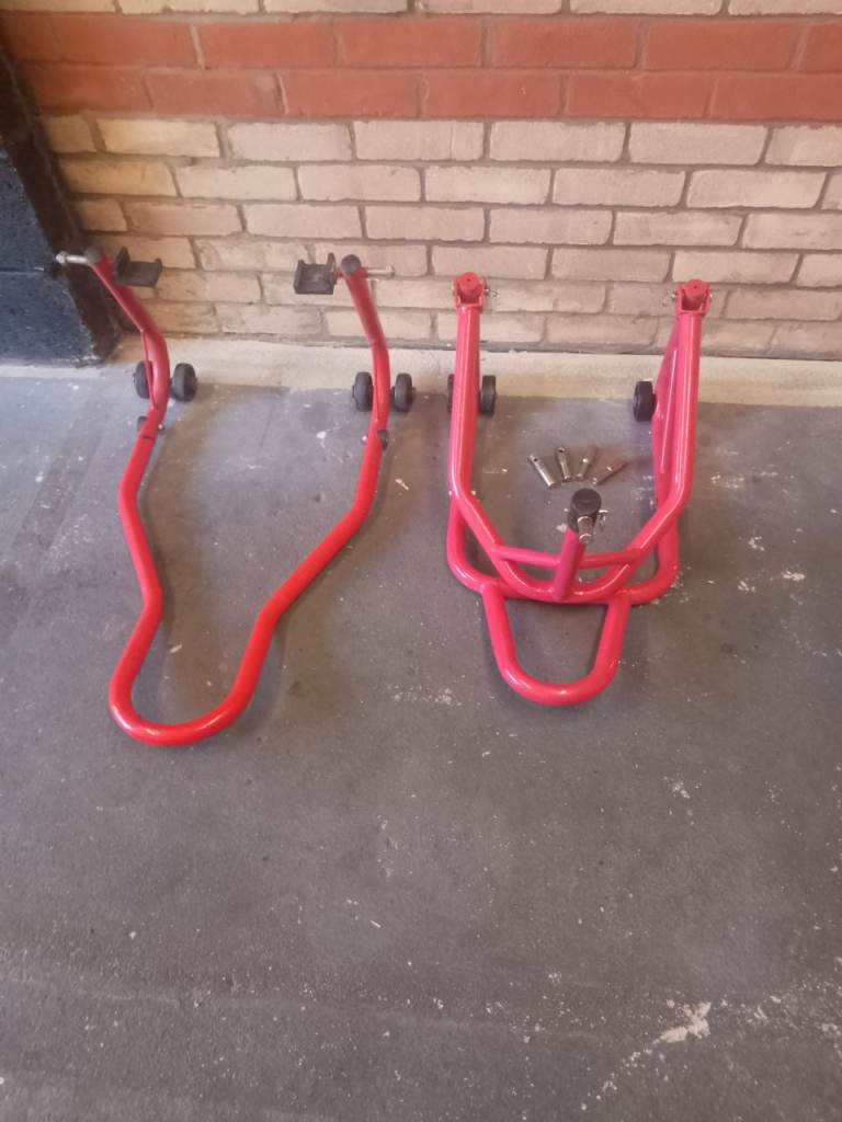 PAIR of Motorcycle Paddock Stands . Front Paddock Stand locates under the bottom yoke , making front fork removal and wheel change very easy , comes with 5 different size adapters . Rear Paddock stand is the style that locates under the swing arm . Location Old Catton NR6
