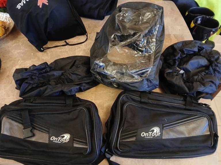 Make. On tour. In excellent condition with Dust covers. Please note the photo showing a waterproof cover has a slight hole in which could be patched, but i don't use this. Its just to store bags in within dry storage. Im not 100% sure of the litre size per bag, but i would say roughly 6 litres. Straps and connectors are all good. No damage to bags. Buyer collects. Or willing to dispatch for correct postage fee extra.