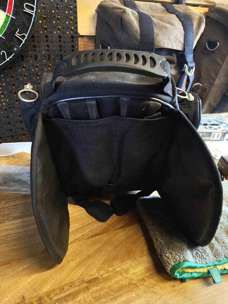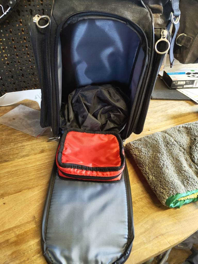 This versatile tank bag with magnetic side holders also doubles as a waterproof rucksack. Never used as the bike I ended up getting had a plastic tank cover.