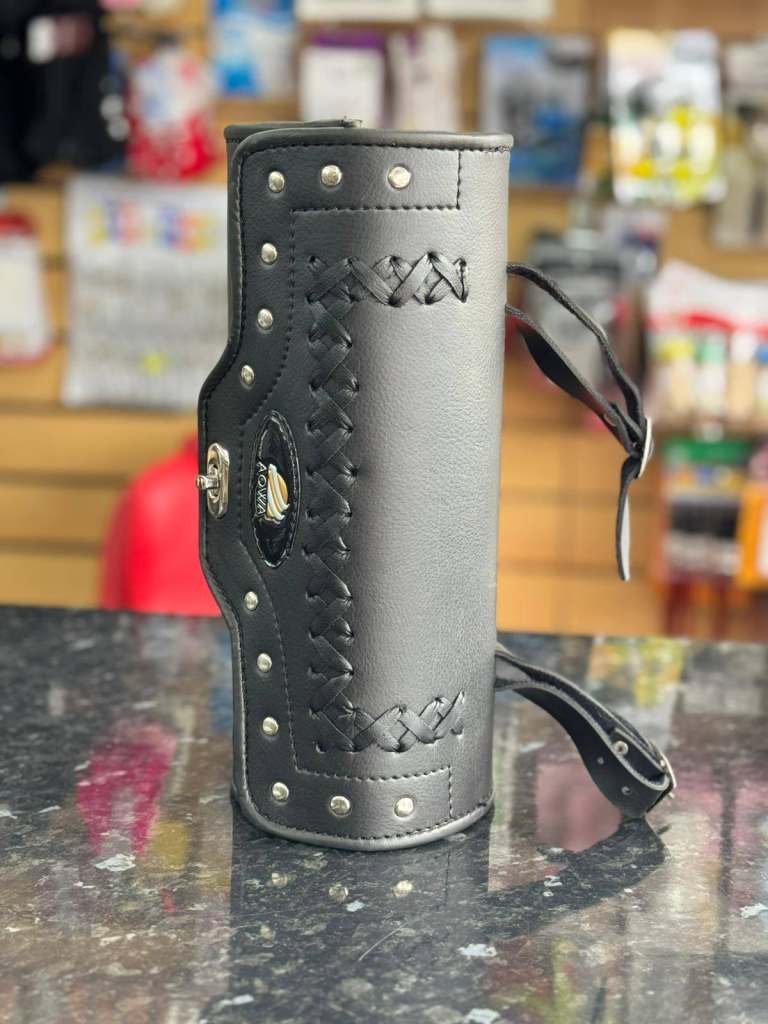 Compact motorcycle tool bag designed in a classic cylindrical shape with studded detailing and reinforced stitching. Features a secure metal clasp closure and a front AQWA emblem for a clean, premium look. Ideal for storing tools, small accessories and on‑the‑go essentials while riding. Durable construction ensures reliability on daily commutes or long‑distance trips, and the compact size mounts easily on most bikes without taking up excess space.