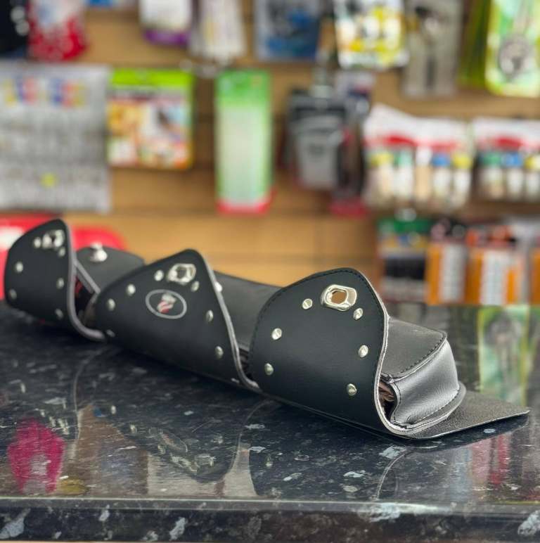 Durable motorcycle tool bag featuring three separate compartments for storing tools, accessories and small essentials while riding. Each pocket is secured with a metal twist‑lock clasp and finished with studded detailing for a classic biker look. Made from sturdy black material with reinforced stitching and a front logo panel. Designed to mount easily on most bikes, offering practical storage without compromising style. Ideal for everyday rides, touring and roadside preparedness.