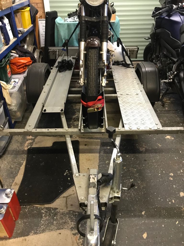 Motorcycle Trailer with upgraded front wheel chock and chequer plate to aid loading. 750Kg max load. Could be easily converted to take two bikes. Spare wheel included.