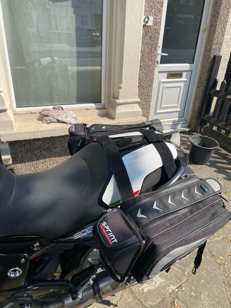Soft panniers which fit almost all motorcycles with a removable seat. Can be used for touring or commuting and can be carried inside once destination reached Lots of safety strapping as standard - Good condition; all there. When in use straps are out of sight underneath seat.