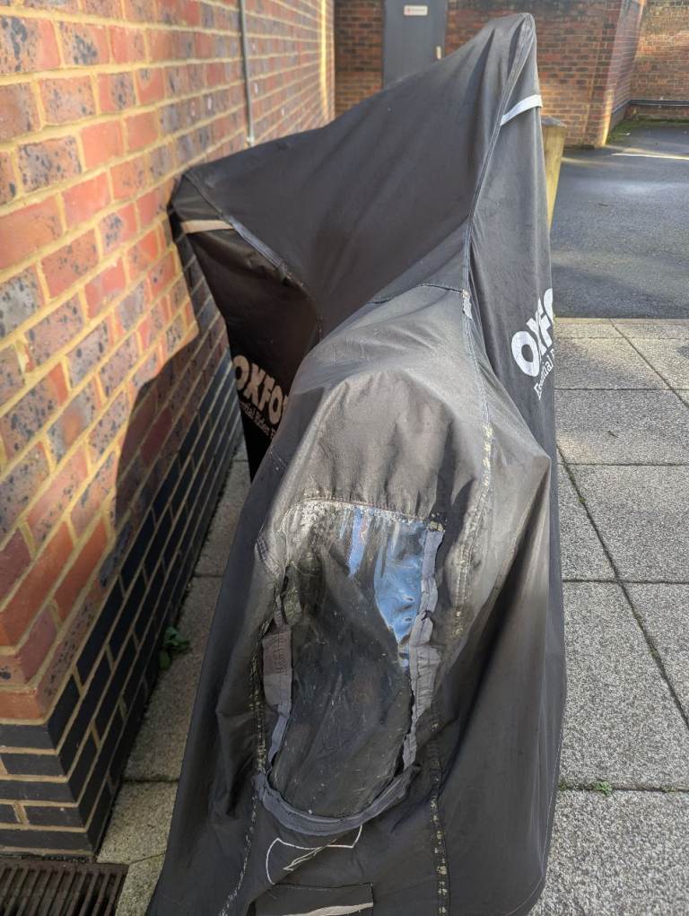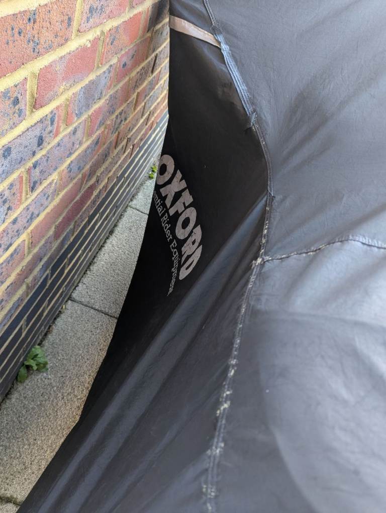 Used Oxford Stormex in medium size. Well used and some of the taped seams have come off but still keeps the bike dry.