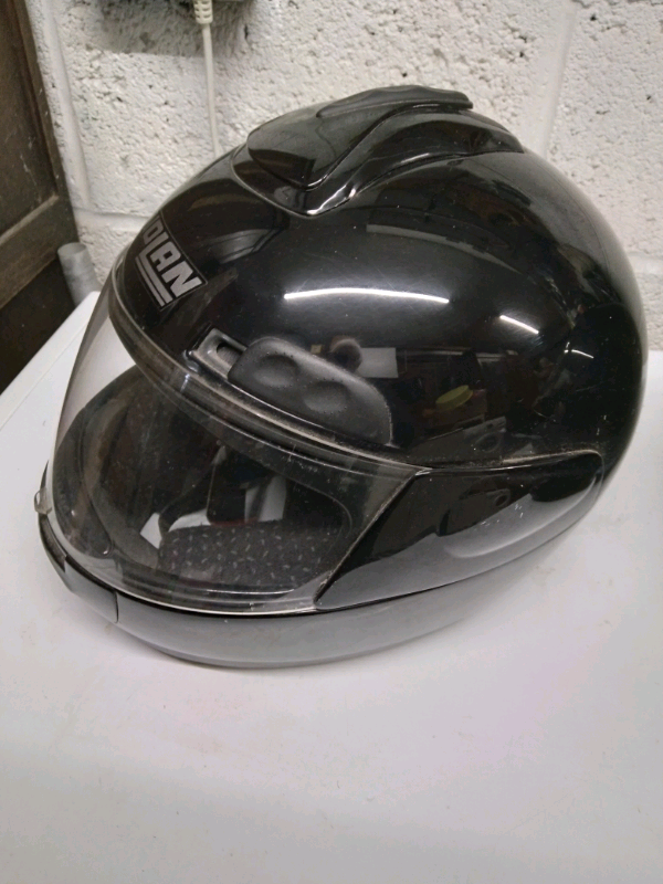 Posting for 3+ yearsTwo black Nolan brand motor cycle helmets.