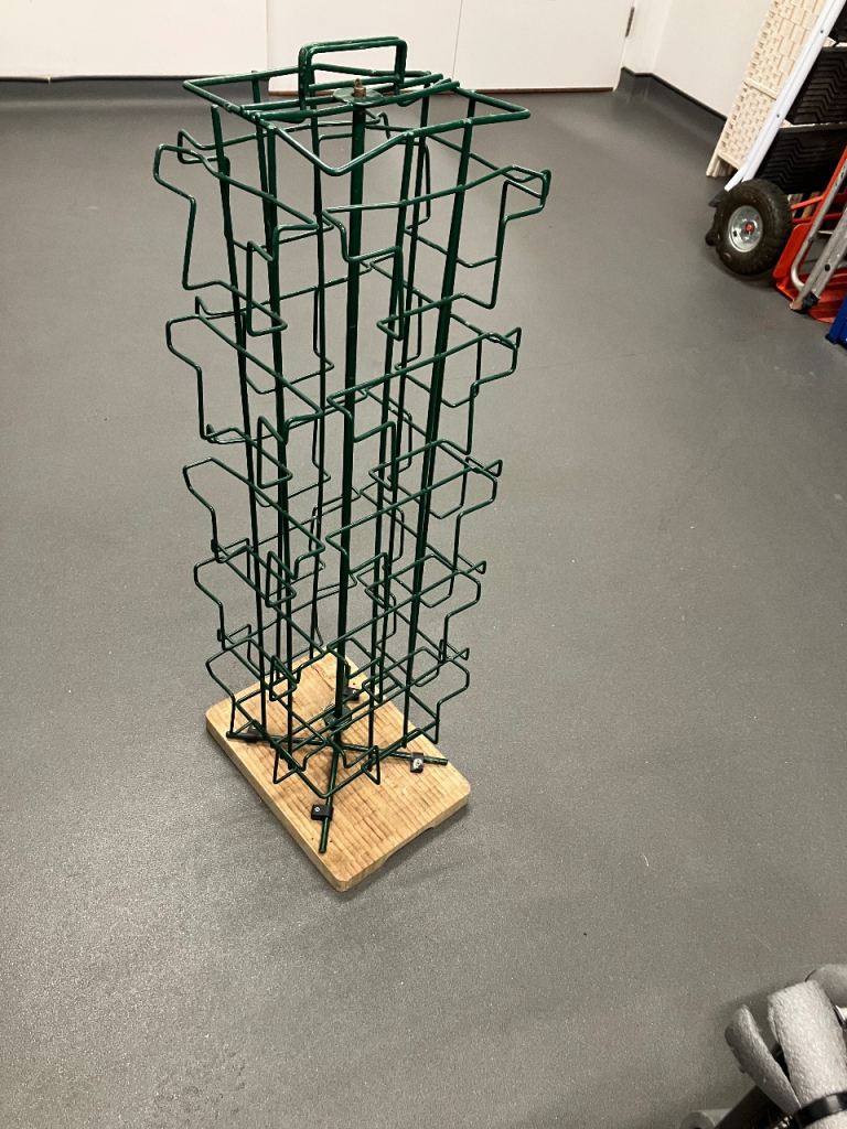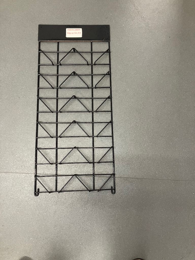 The spinner is in very good condition, comes on a block wood base and stands about 3 feet high. It’s incredibly useful for displaying postcards/cards up to 17cms width and can easily stand on a table for display purposes. The other item is a standard rack for postcards and can hang either on a door or wall.