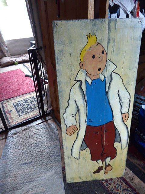 Tin Tin Sign - Oil Paint on Wooden Board - 19 inches wide x 46 inches high - screw holes in each corner (4) - very old - no worm in the wood