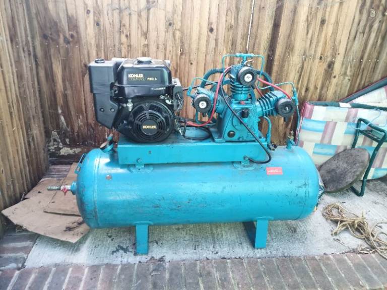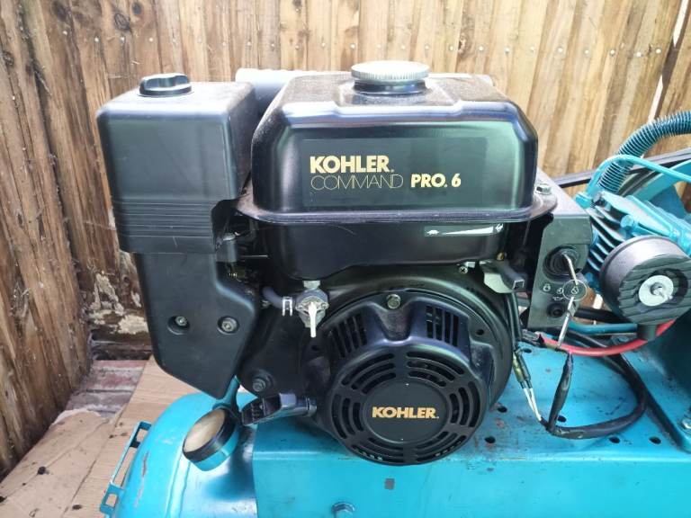 Kohler petrol engine driven compressor. 3 air cylinder owned from new. Excellent working order. New starter battery. Electric start or pull cord backup. Belt guards not shown in photos. Location Snodland Kent collection only