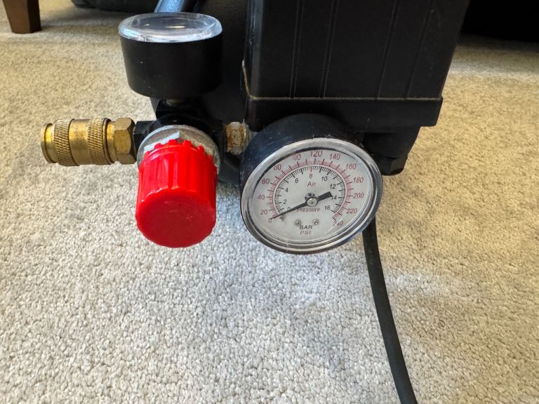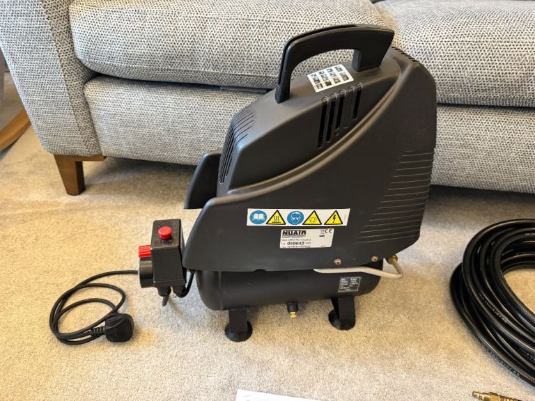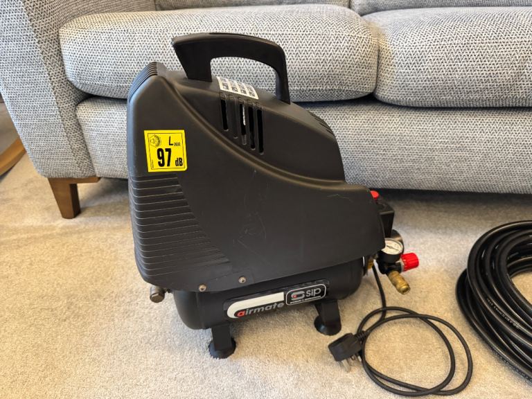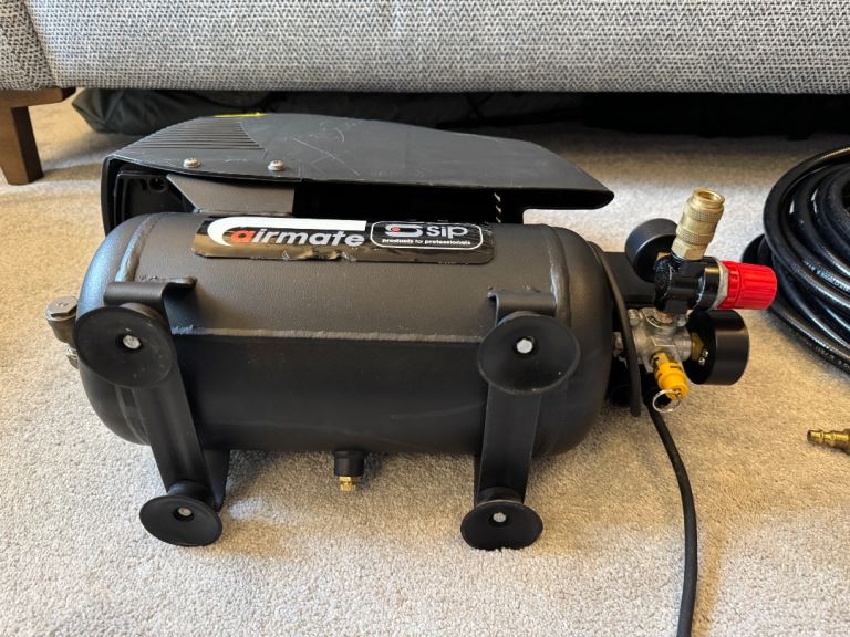 The Airmate TN 1.5/6-O compressor is made by professional equipment supplier SIP. It’s oil less. Works perfectly, holds pressure, no leaks, turns on and off as expected, drain plug still operates. Has two pressure gauges, one for tank pressure and the other gauge works with the adjustable outlet pressure to monitor delivery. 8 bar maximum pressure and 6 litre tank. 240v so works on residential main power and comes with moulded UK plug. Comes with a copy of the owners manual. I think this cost me a couple of hundred pounds without the air line kit.
