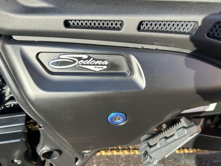 Introducing the all-new Sedona 250, designed for those who crave the open road. Prepare for an exhilarating ride with its powerful V-twin engine while maintaining exceptional fuel efficiency. The sleek design and comfortable seating make it perfect for long journeys or quick trips around town. Experience style, performance, and comfort with this stunning cruiser.