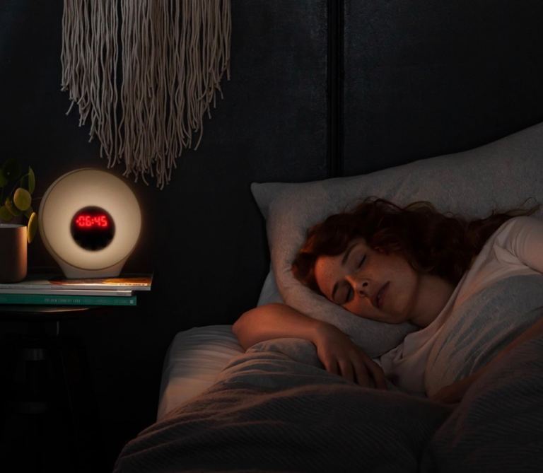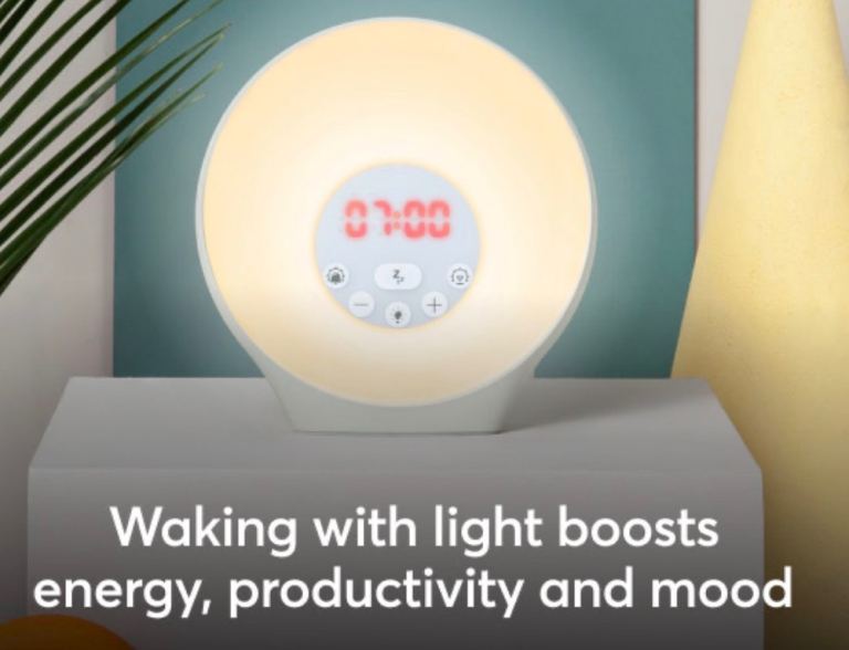 Lumie alarm with 30 minute sunrise/sunset duration, dimmable bedside lighting with ten levels of white light, six coloured mood lighting options, six wake sounds and snooze button.