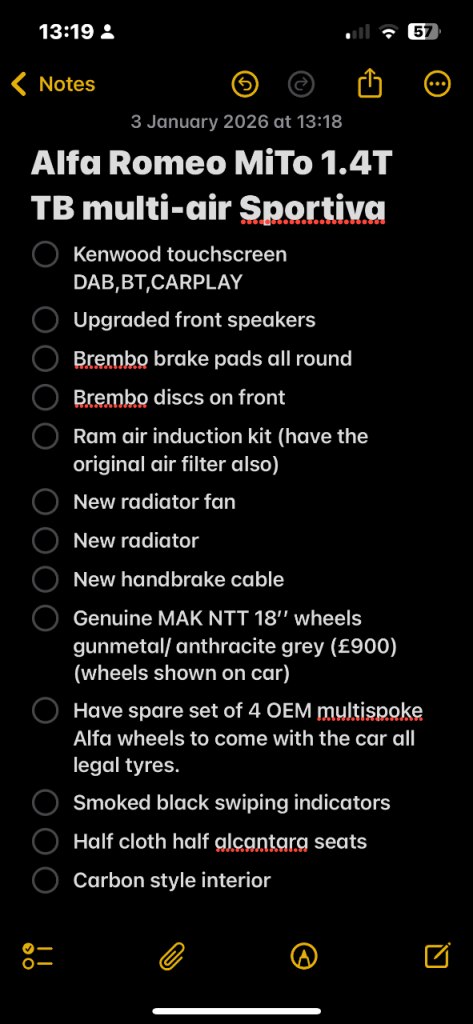 Here’s my MiTo for sale, lovely car and will be sad to see it go. Have put quite a lot of money into this car as seen in last photo and has always treated me well. Great car for new driver or second car quite nippy little car with 3 different driving modes(allterrain,dynamic,normal)