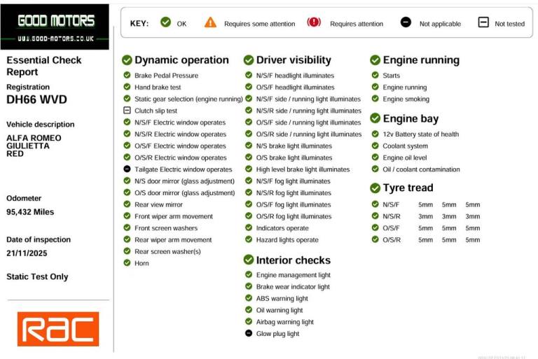 +++ YOU CAN BUY ANY CAR WITH A PART PAYMENT OF JUST £500 THE CAR MUST BE COLLECTED/PAID IN FULL WITHIN 7 DAYS +++ +++SAME DAY NATIONWIDE DELIVERY AVAILABLE+++ +++OVER 150 VEHICLES IN STOCK+++WWW.GOOD-MOTORS.CO.UK+++ +++FINANCE AVAILABLE+++HERE WE HAVE ANOTHER CAREFULLY SELECTED PART EXCHANGE VEHICLE, A VERY NICE EXAMPLE, COMES WITH WARRANTY, FULL SERVICE HISTORY, ONE OWNER FROM NEW 0 FORMER KEEPERS, COMES WITH MOT TILL AUGUST 2026, THE VEHICLE IS IN GOOD CONDITION BOTH INSIDE AND OUT. NON-SMOKER OR PET OWNER CAR, SUPERB SPEC INCLUDING: FULL MAP SAT NAV, LEATHER INTERIOR, HEATED FRONT SEATS, COLOUR TOUCH SCREEN DISPLAY, DAB RADIO, BLUETOOTH HANDS FREE, AUDIO STREAMING, USB AND AUXILIARY INPUT SOCKET, DUAL CLIMATE CONTROL. CRUISE CONTROL, SPEED LIMITER, DAY TIME RUNNING LIGHTS. REAR LED LIGHTS. AUTO LIGHTS. AUTO WIPERS. ELECTRIC WINDOWS, ELECTRIC POWER FOLDING MIRRORS, CENTRAL LOCKING, AIR CONDITIONING, PARKING SENSORS, TYRE PRESSURE MONITORING SYSTEM. ISOFIX & CHILD LOCKS. MULTI FUNCTION STEERING WHEEL CONTROLS. PRIVACY GLASS. ALLOYS, SUPPLIED WITH 2 REMOTE KEYS. 35 POINT HEALTH CHECK WITH 20 MILE TEST DRIVE, HPI CLEAR WITH AND VOSA MILEAGE REPORT, EXTENDED RAC WARRANTIES WITH BREAKDOWN COVER AVAILABLE, ALL BANK TRANSFERS WELCOME, VIEW OVER 150 SIMILAR CARS ON OUR WEBSITE +++WWW.GOOD-MOTORS.CO.UK+++ EVERY EFFORT HAS BEEN MADE TO ENSURE THE ACCURACY OF THE INFORMATION ABOVE. HOWEVER, ERRORS MAY OCCUR. CHECK WITH A SALESPERSON ABOUT ITEMS WHICH MAY AFFECT YOUR DECISION TO PURCHASE. .18in Alloy Wheels - Dual 5 Spoke Design , 6 Airbags - Driver-Passenger-Front Side , 60-40 Split Folding Rear Seats, Cruise Control, DAB Radio, 18in Alloy Wheels - Dual 5 Spoke Design with Titanium Finish, 6 Airbags - Driver-Passenger-Front Side and Window, 60-40 Split Folding Rear Seats, Airbags - Passenger Deactivation, Alfa Code Immobiliser and Alarm System, Alfa DNA Driving Mode Selector, Armrest - Rear with Storage, Bluetooth Handsfree, Body Coloured Bumpers, Brembo Braking System with Alfa Romeo Red Brake Callipers, Climate Control - Automatic Dual Zone, Cruise Control, DAB Radio, Dark Anthracite Exterior Finishing, Dark Flair Fire Trim Inserts, Dashboard Surround and Door Panels in Carbon Fibre Finish, Daytime Running Lights - LED, Door Mirrors - Dark Anthracite, Door Mirrors - Electrically Adjustable and Heated, EPS - Electric Power Assisted Steering, Electric Windows - Front and Rear, Electronic Key with Remote Central Locking and Boot Release, Electronic Q2 Differential, Exterior Veloce Badging, Flat-Bottomed Sports Leather Steering Wheel with Red Stitching, Floor Mats, Front Fog Lights, Front and Rear Parking Sensors, Headlights - Carbon Effect, Headlining - Darkened Interior, ISOFIX Attachments for Child Seat Protection, Kick Plates - Aluminium, Multifunctional Display and Trip Computer, Oversized Twin Exhaust, Parking Sensors - Rear, Privacy Glass, Rear Cluster Lights - LED, Rear Spoiler, Safe Lock, Seats - Drivers Height Adjustment, Seats - Passenger Height Adjustment, Side Skirts, Space Saver Spare Steel Wheel - 17-18in, Sport Seats with Integrated Headrests, Sports Dials with White Illumination, Sports Front Splitter and Rear DAM with Alfa Red Detailing, Sports Pedals - Aluminium, Steering Wheel - Paddles, Storage - Front Seat Back Pockets, Suspension - Lowered Sports, TPMS - Tyre Pressure Monitoring System, Uconnect 6.5in Colour Touchscreen Navigation, VDC - Vehicle Dynamic Control, Visibility Pack, Alfa Red, Leather and Alcantara with Alfa Romeo Logo - Black with Red Stitching, Seats - Heated Front