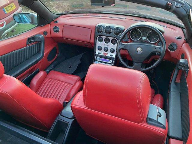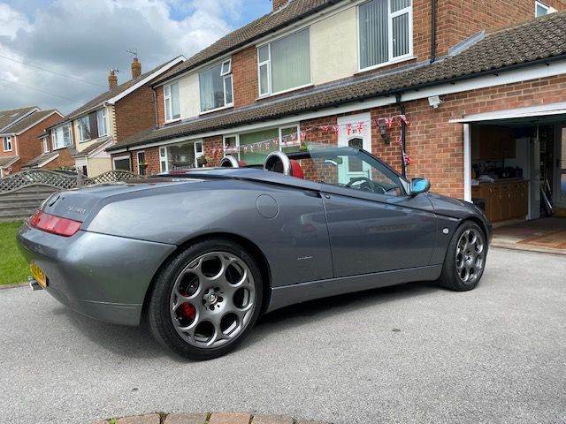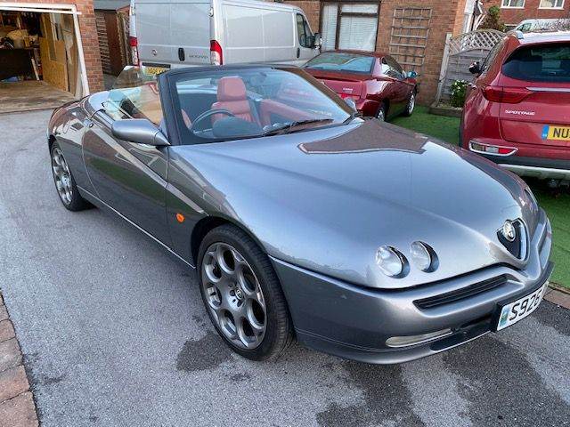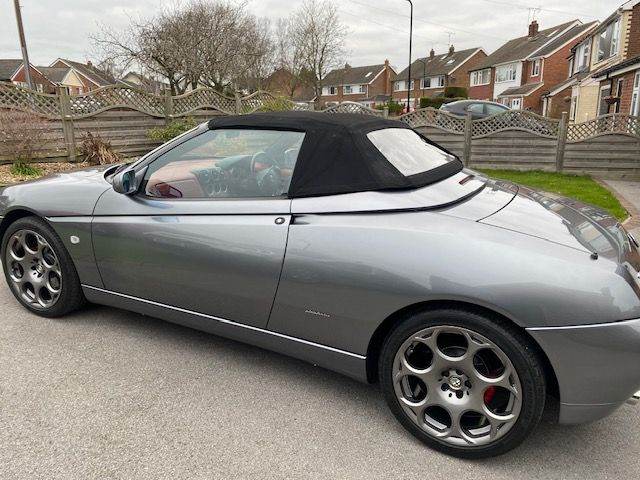 Hi .For sale is my lovely Alfa spider 2lt twin spark in metallic grey with red leather interior .The car has a large folder of history and has been will looked after ,In my ownership i have fitted 18inch black line gt wheels fully refurbished ,i have original wheels too .new vented ,drilled brake discs all round, chrome roll hoops with wind deflector , stainless exhaust cat back sounds nice !