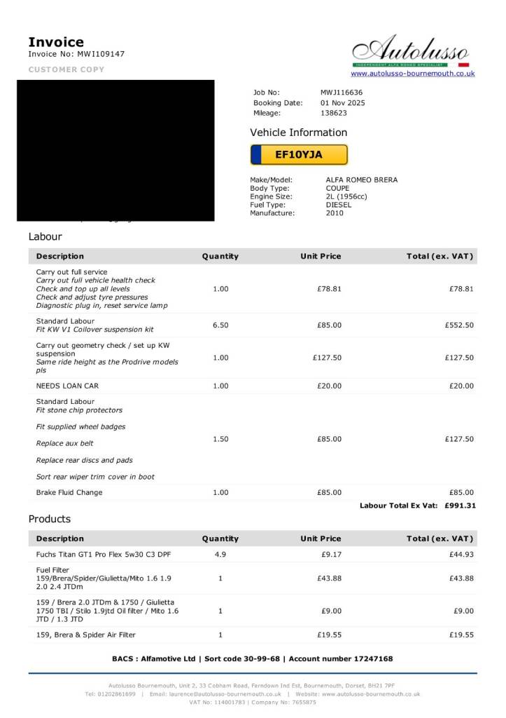 For further peace of mind, the car received a full service and health check at Autolusso Bournemouth in November 2025 — one of the UK's most respected Alfa specialists — where Laurance Preston described it as one of the best-maintained Breras he'd seen. You're welcome to call him directly for his view.