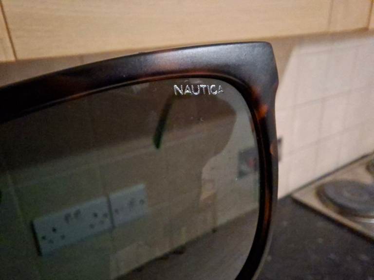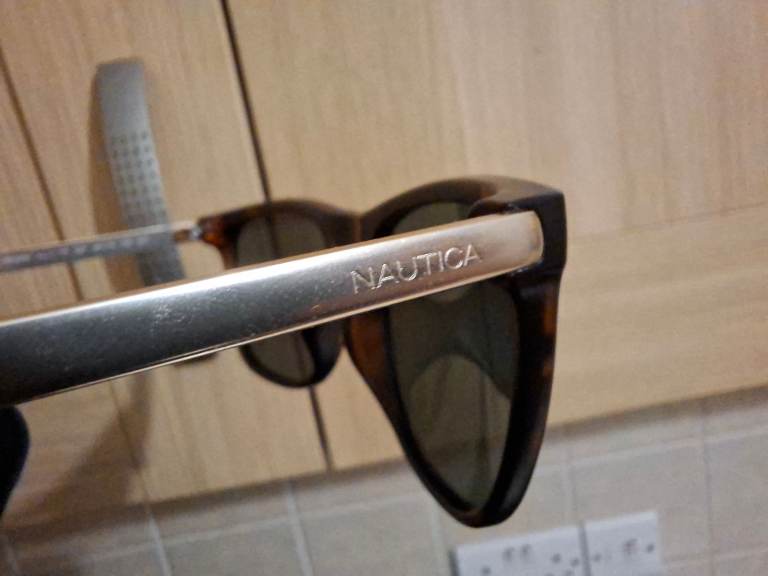Stylish, casual brown design sunglasses with polarized UV-protected grey lenses. From Nautica, a reputable brand.