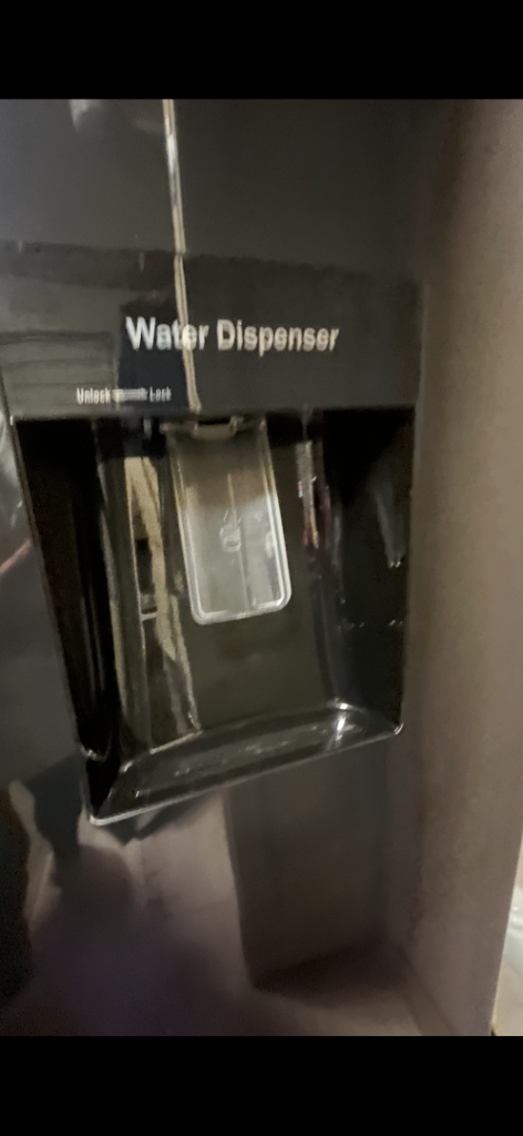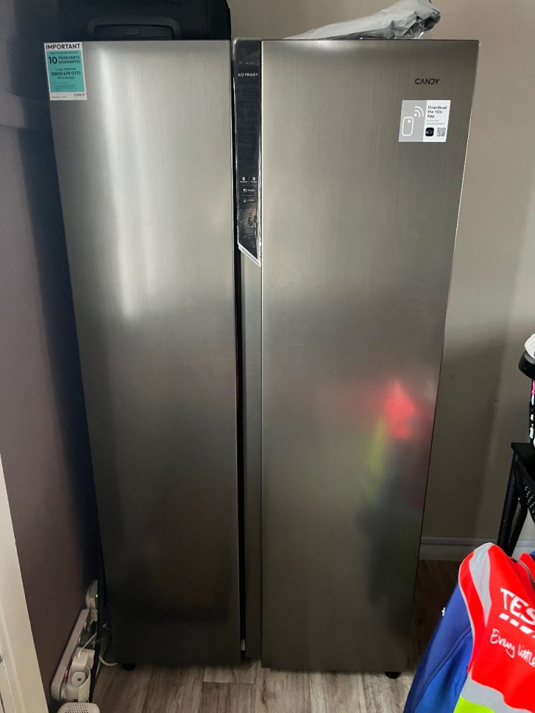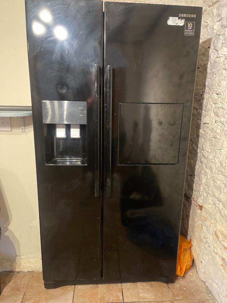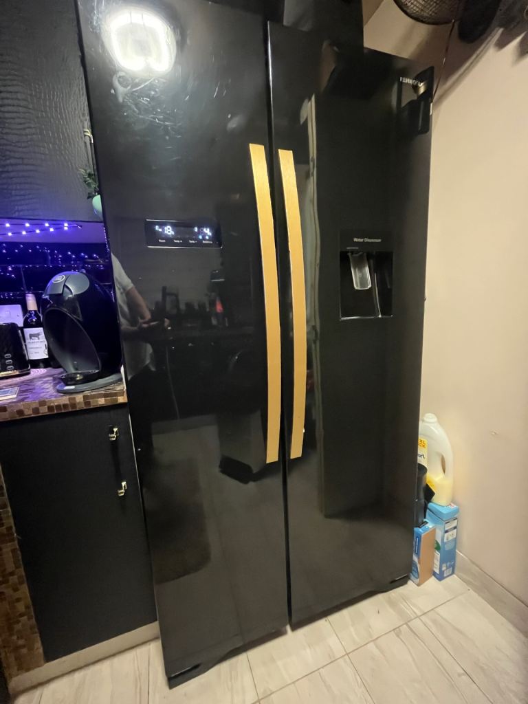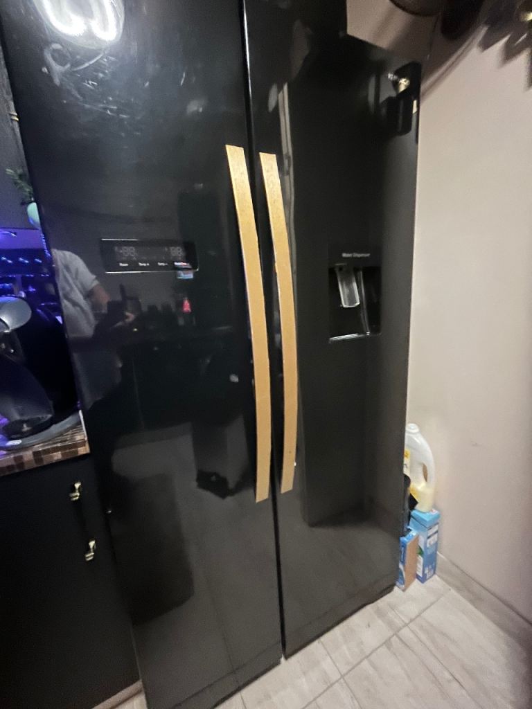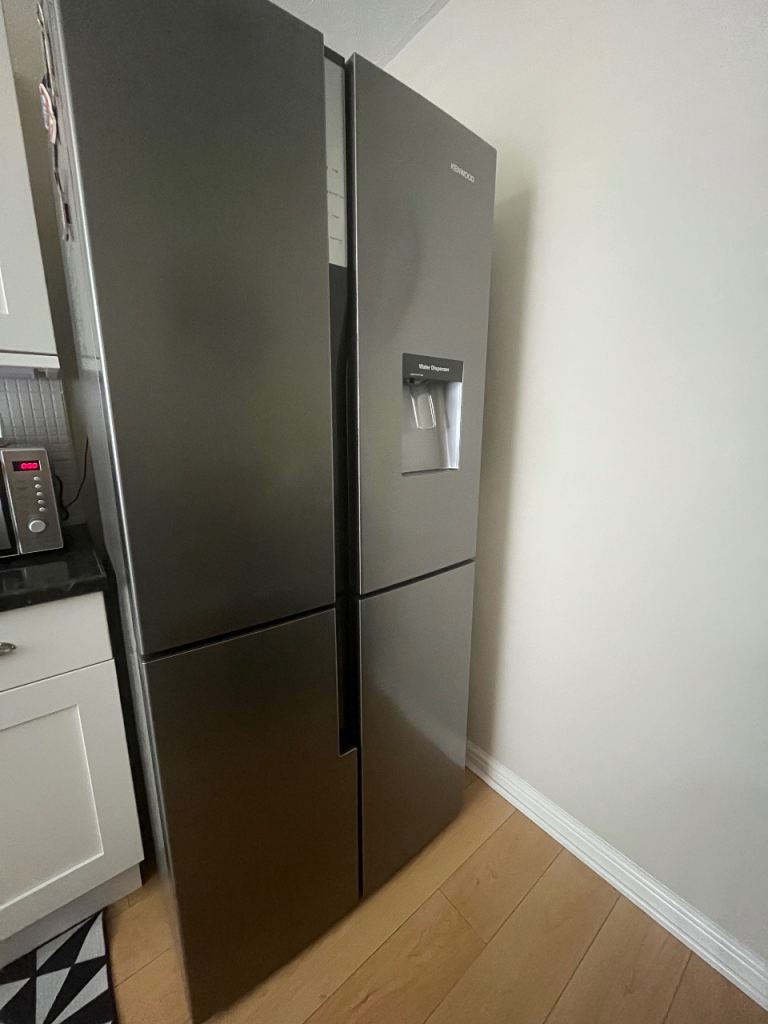 Kenwood American fridge freezer. Black in colour. A+ energy consumption and can hold around 564l. Has a water dispenser which is non plumbed and ice making tray in freezer.