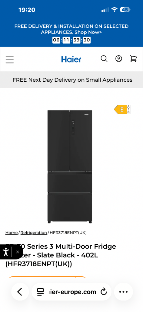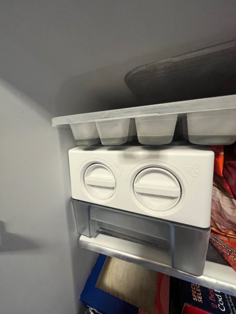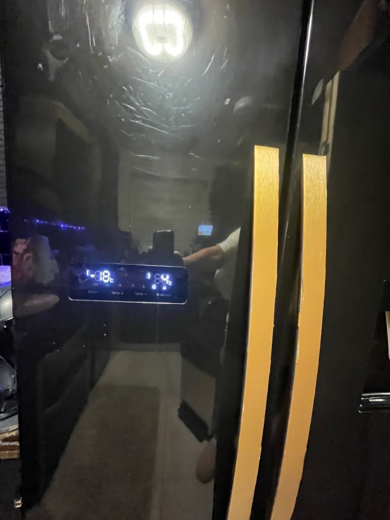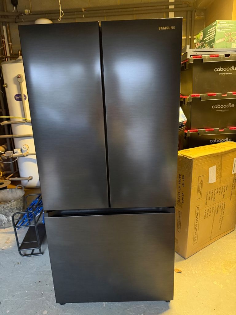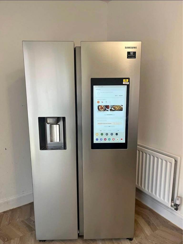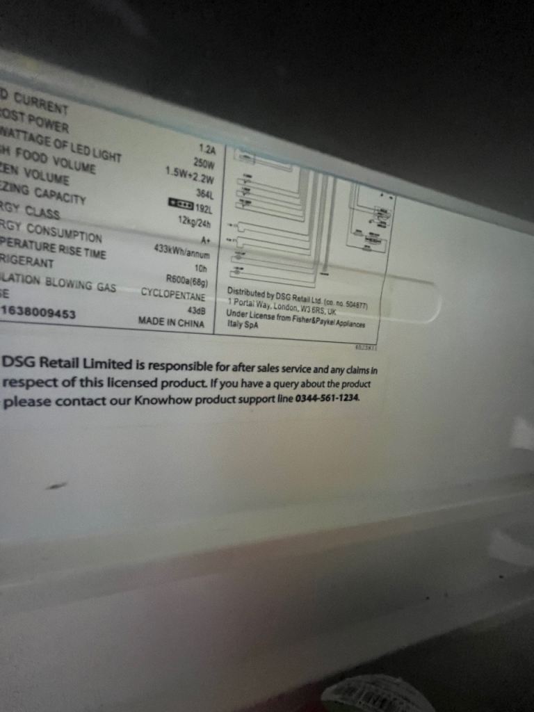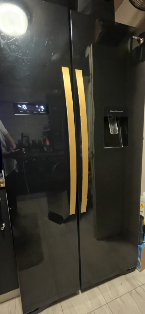 Kenwood American fridge freezer. Black in colour. A+ energy consumption and can hold around 564l. Has a water dispenser which is non plumbed and ice making tray in freezer.