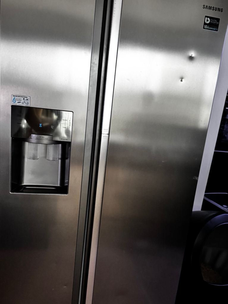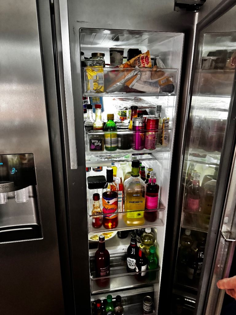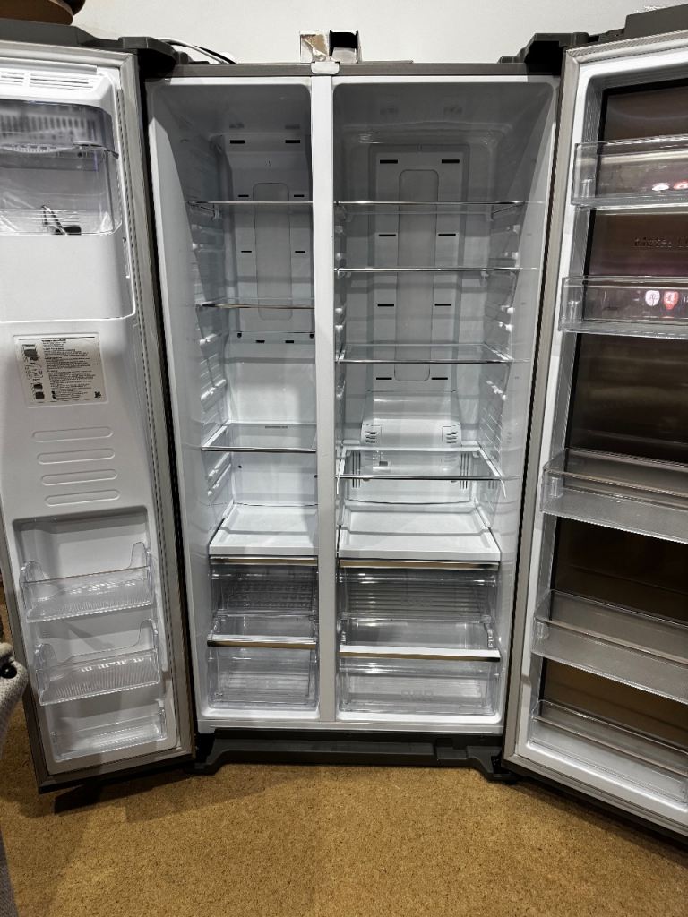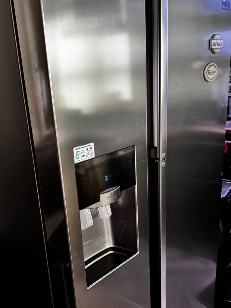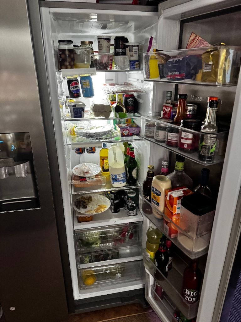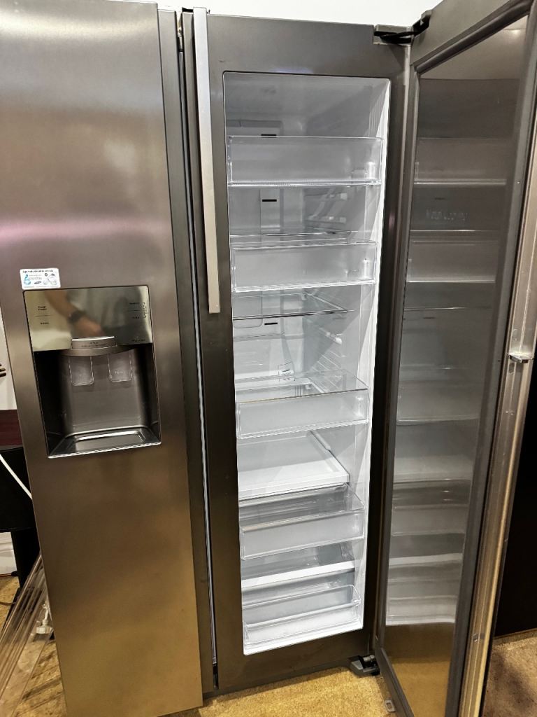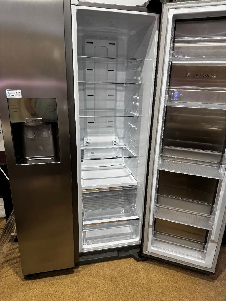 Samsung Showcase American Fridge Freezer, can open fridge door to access entire fridge door shelves without accessing main fridge, or open both to access entire fridge, quite an exceptional idea and a good showpiece. Is around 5 years old, fully functional although has a couple of dents from a couple of moves, ‘nothing a couple of fridge magnets wouldn’t hide’ one or two pieces of plastic pieces chipped etc but all works, requires plumbing for on demand ice and water.