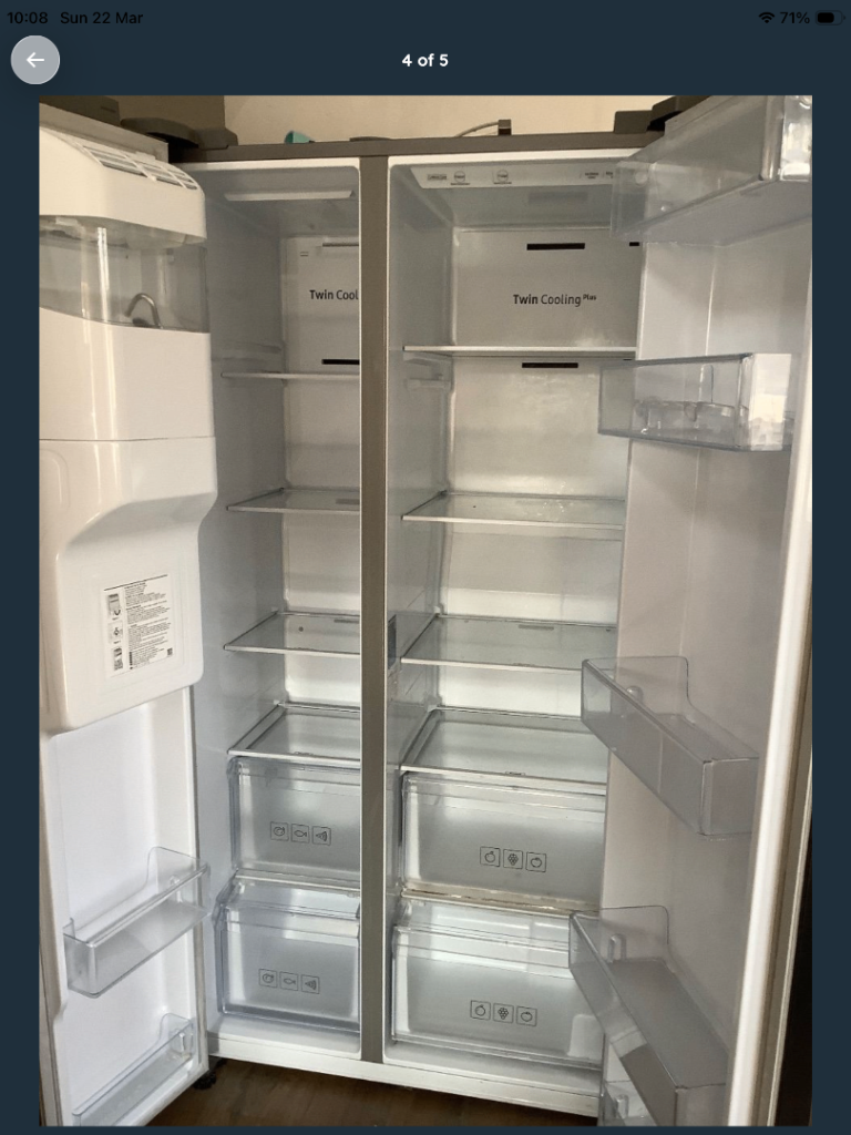 Samsung American style fridge freezer with water/ice dispenser, also comes with spare parts for water dispenser. In fair condition, has few marks on front but in good working order. Cash on collection only, no bank transfers. Cannot deliver. Needs two people to collect. Needs to go this weekend.