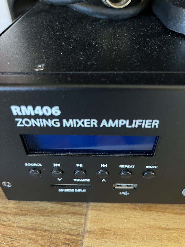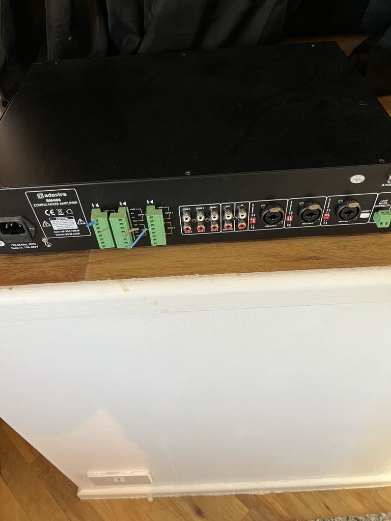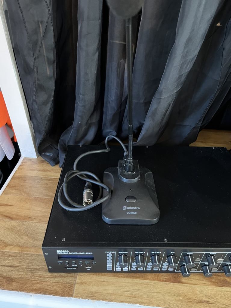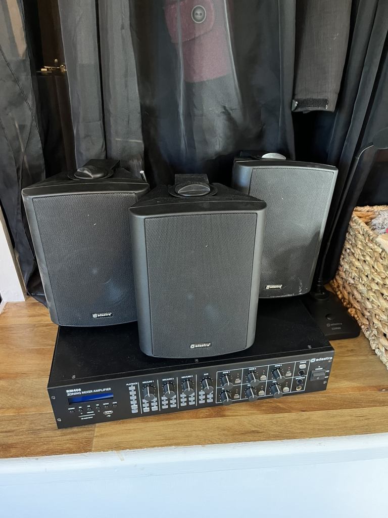 Amplifier mic and 3 speakers used in a large retail store about 4 years old collection only