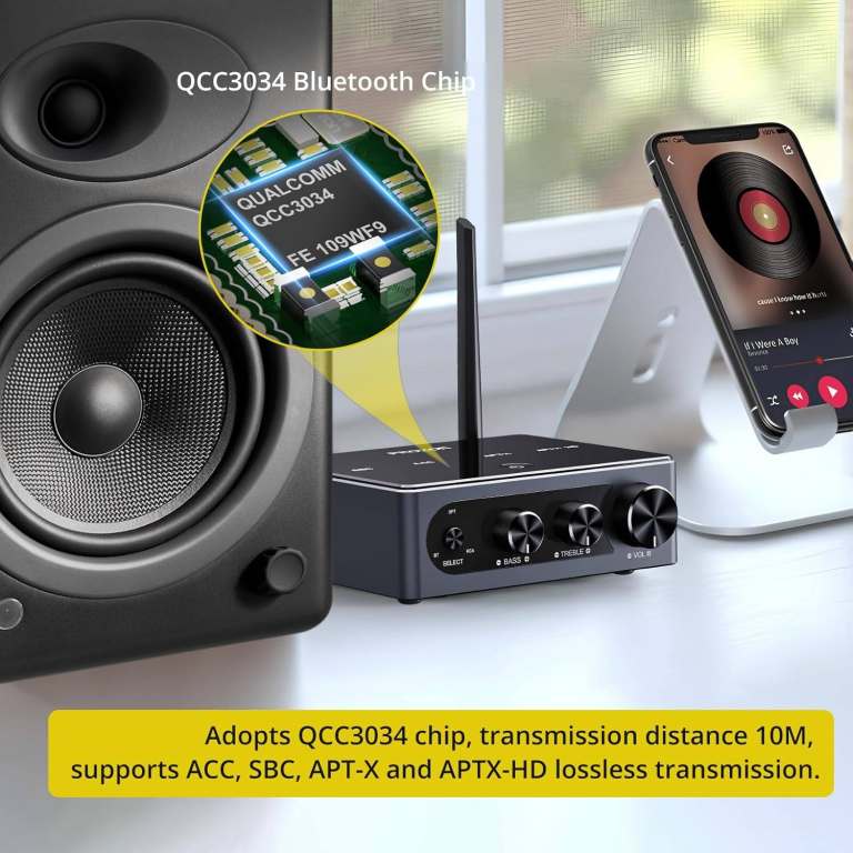 【Personalized Audio Controls】--- Customize Your Audio with Bass & Treble Knobs. Bluetooth Amplifier Has Built-in DAC Supports 192kHz/24bit Decoding, Ensuring Rich Clear Sound.