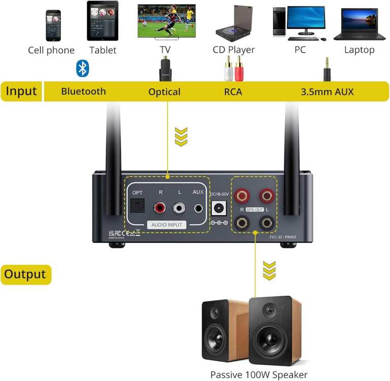 【4 Connectivity Options】 --- Stereo Amplifier Bridges 4 Inputs (Bluetooth/Optical/RCA/AUX), Catering to Various Device Connection Needs Such as Smartphones, Computers, and TVs, Providing a Wider Range of Usage Scenarios & Stable Bluetooth Connectivity,