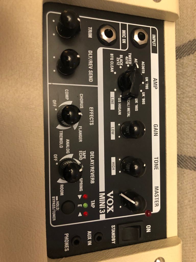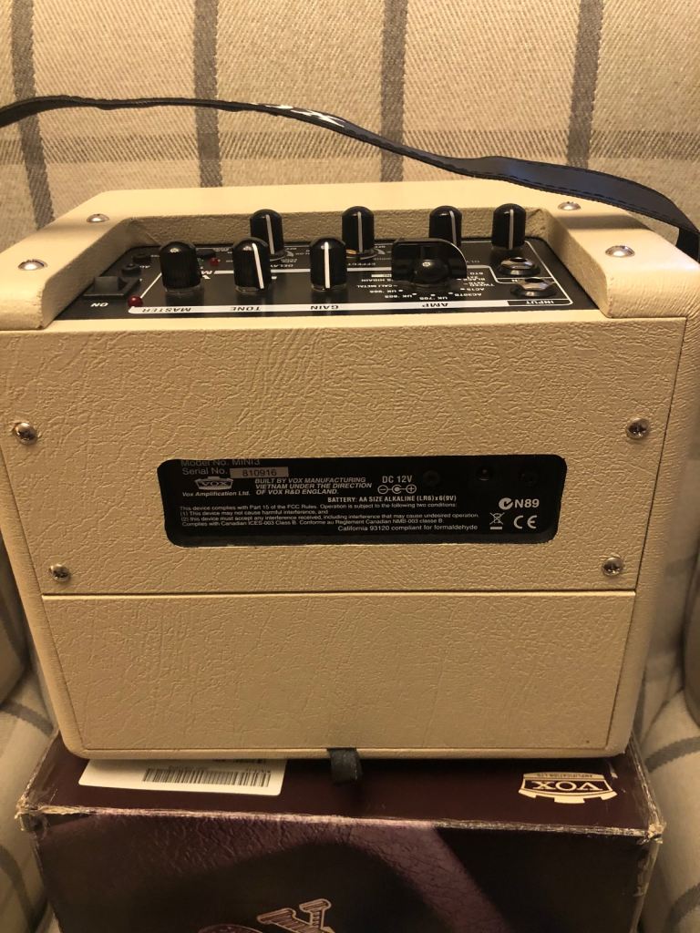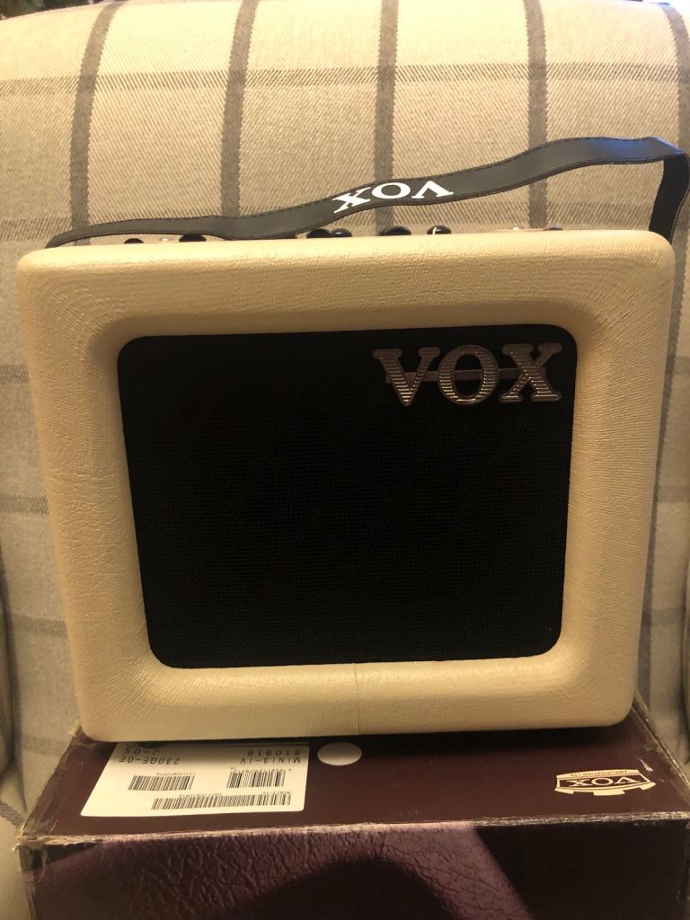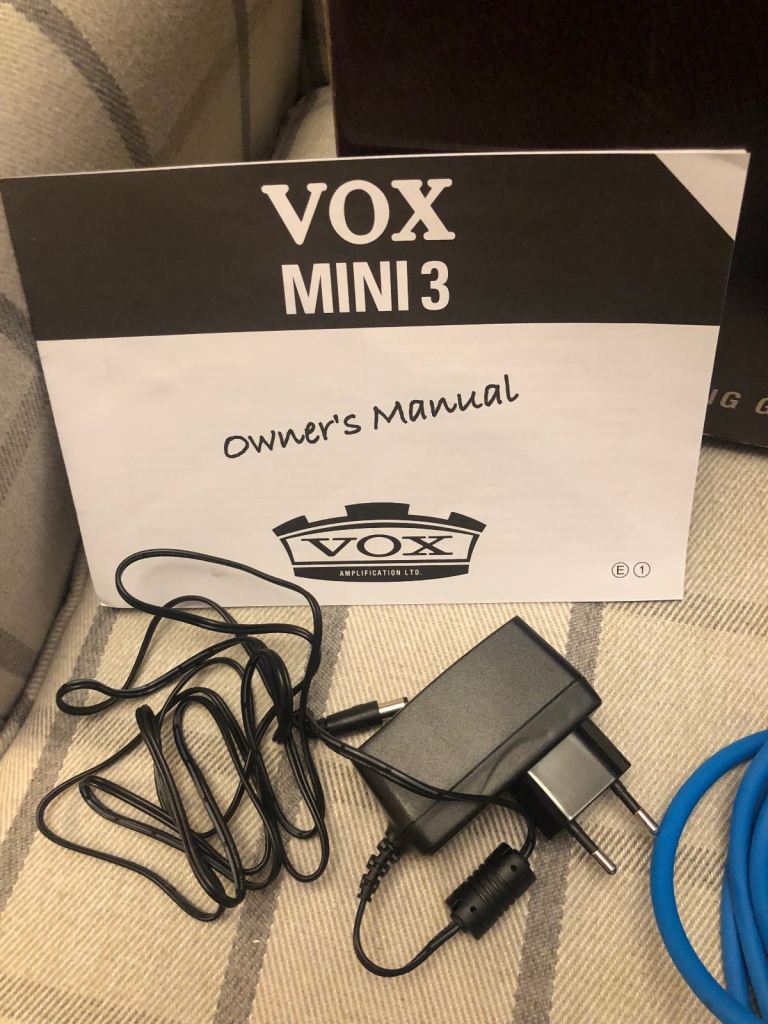 VOX Mini 3 amp in excellent, as new condition. Used about 3 times. Cream colour. With box, user manual, AC mains lead and a long great quality guitar/instrument cable as well. Also runs on 6 AA batteries.