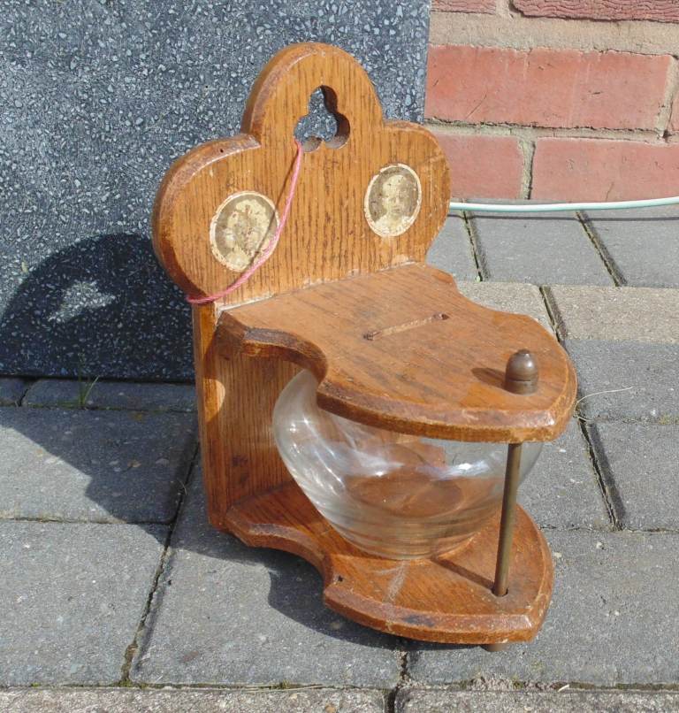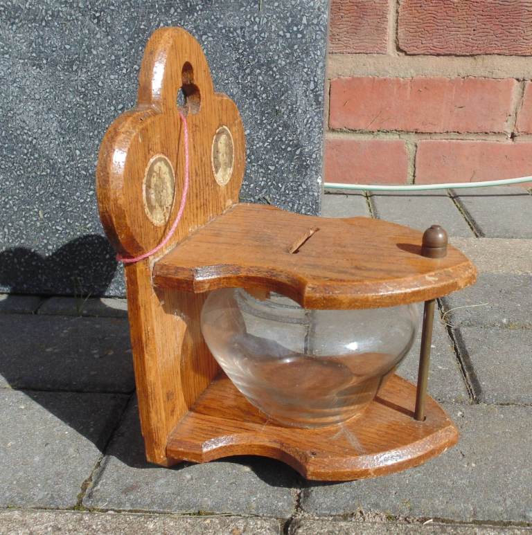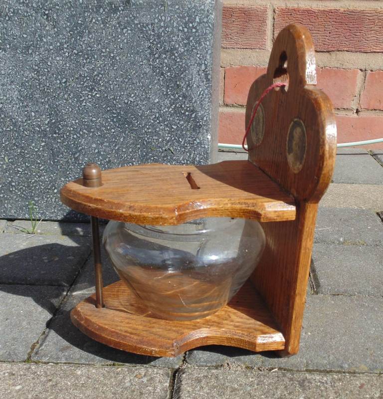 Here we have a 'archibald primary bank' money box made from wood with a glass bowl. In great condition with age related wear and tear. Ref. (#1586)