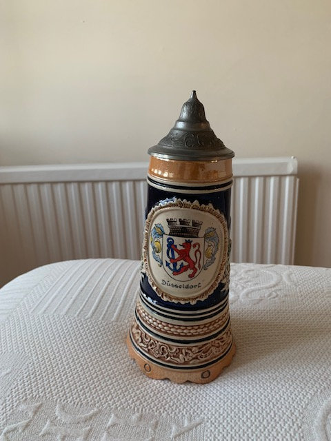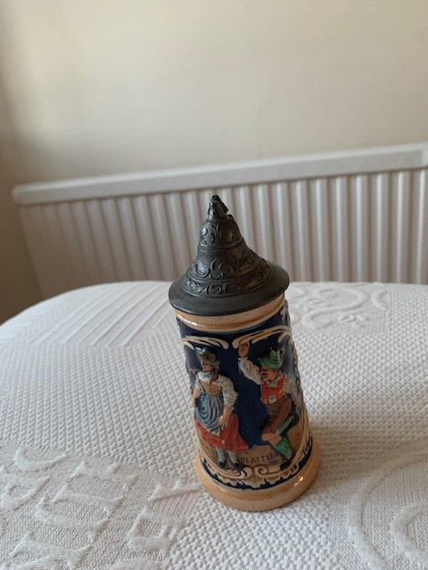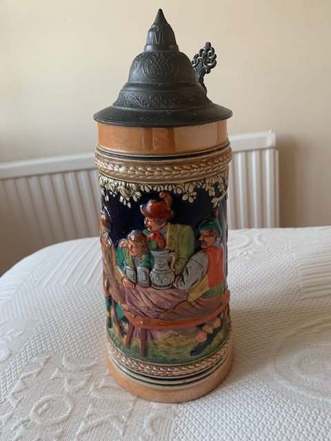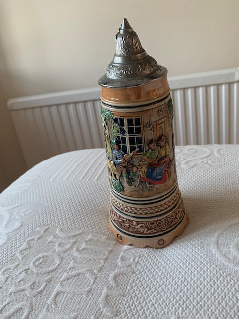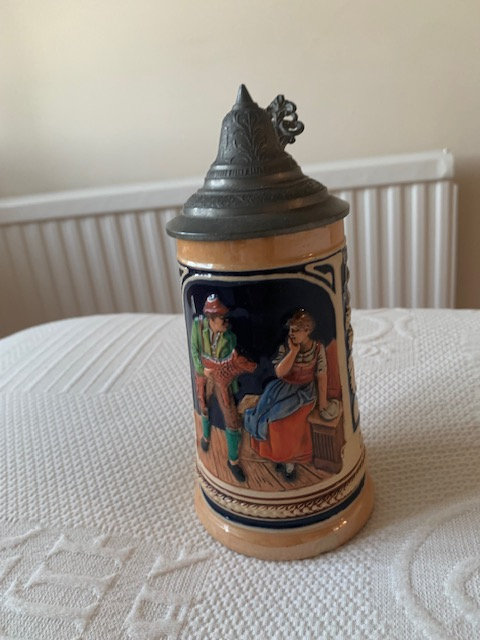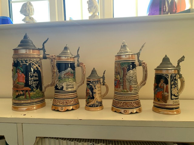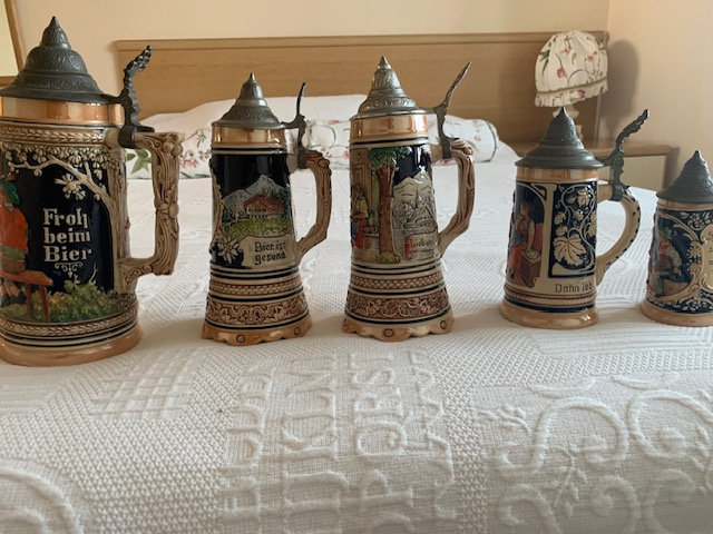 Posting for 12+ yearsFIVE GERMAN STEIN TANKARDS, two with musical key underneath