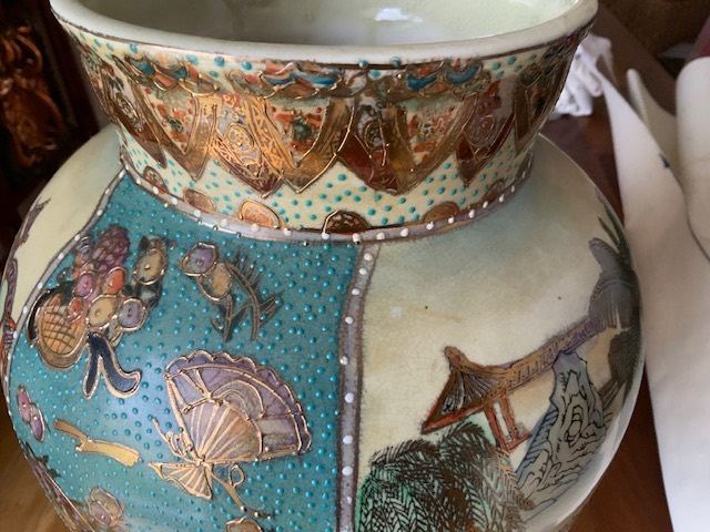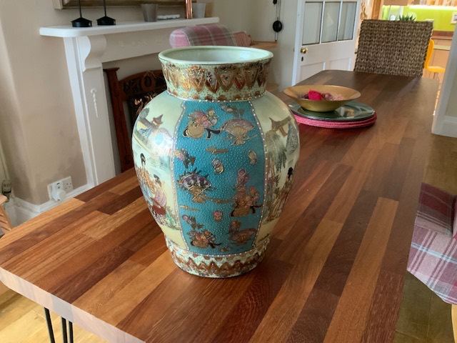 VERY ATTRACTIVE LARGE (35CM H) RICHLY DECORATED ORIGINAL VINTAGE CHINESE POTTERY VASE. NO CRACKS OR CHIPS. BUYER TO COLLECT CHELTENHAM.