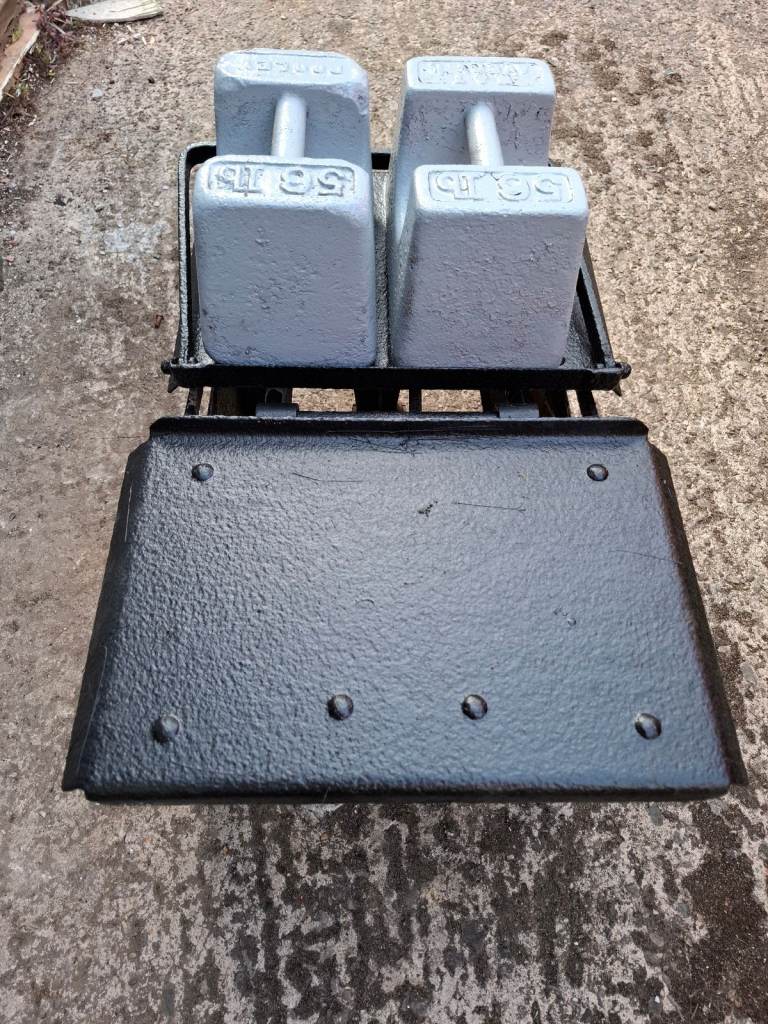1940s Coal Merchants scales with two 56 lb weights, previously used as a telephone table. Abstract feature with many applications for the imaginative. Will deliver in or around South Yorkshire £5.00 to £10.00.