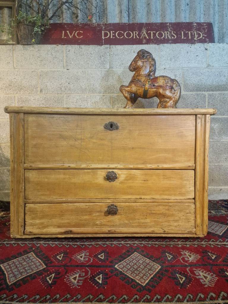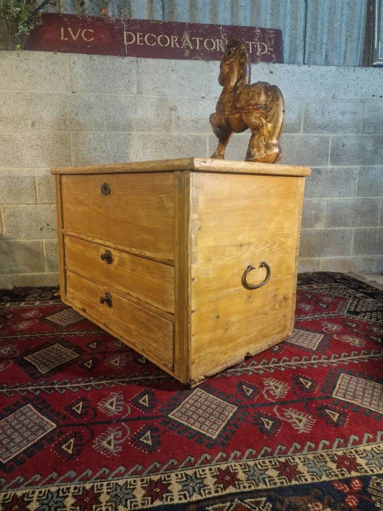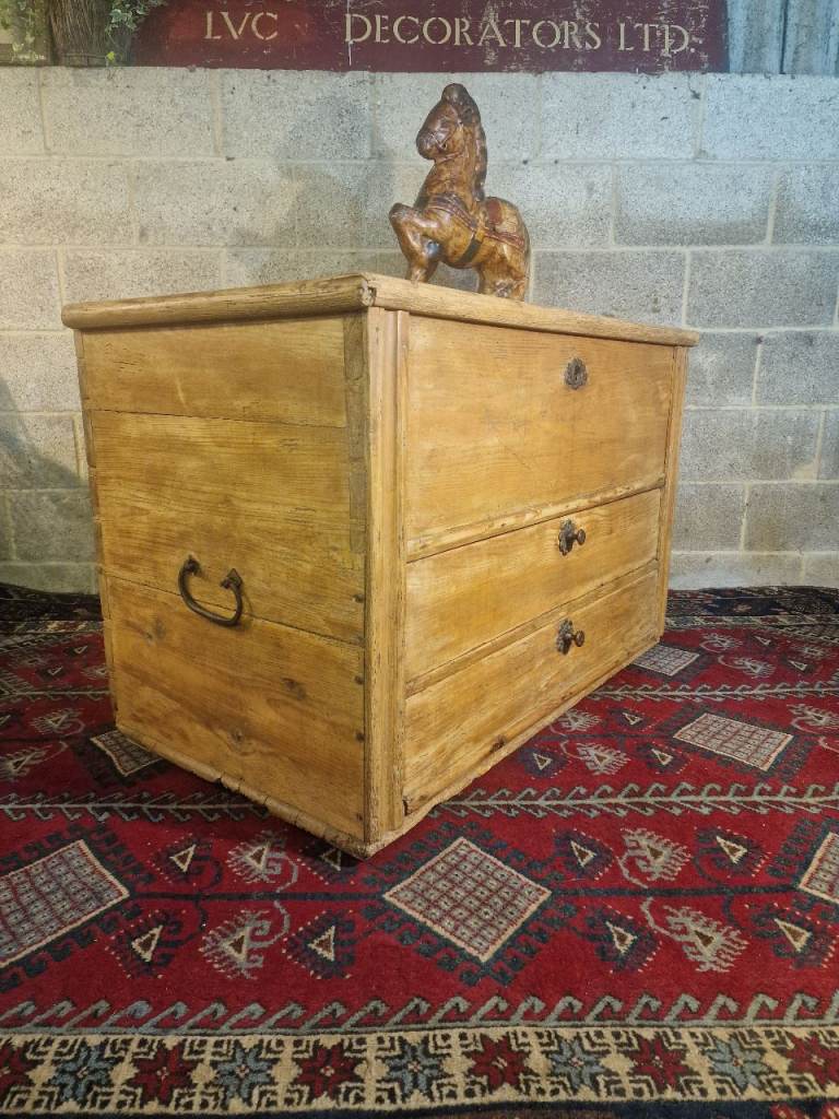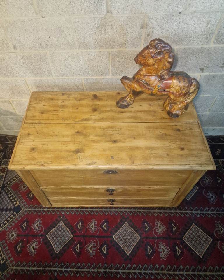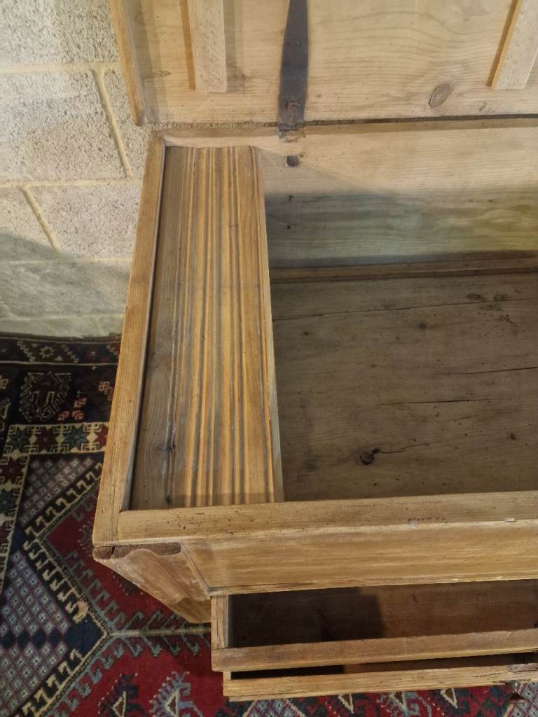 The plank-top lid opens smoothly to reveal generous internal storage—ideal for blankets, linens, or household essentials—while the fitted candle box provides a lovely nod to its period origins. The two full-width lower drawers glide well and are dressed with later but sympathetic metal rosette pulls. The chest sits square and sturdy, retaining the authentic marks, wear, and patina that make true antique pine so sought after.