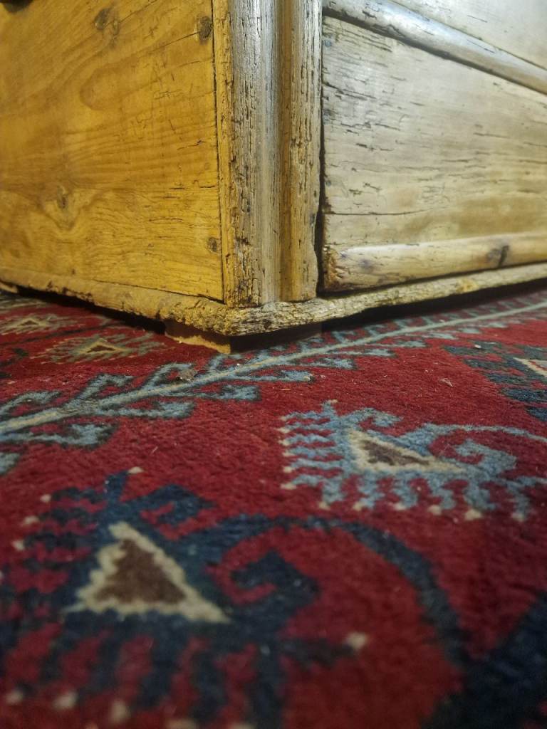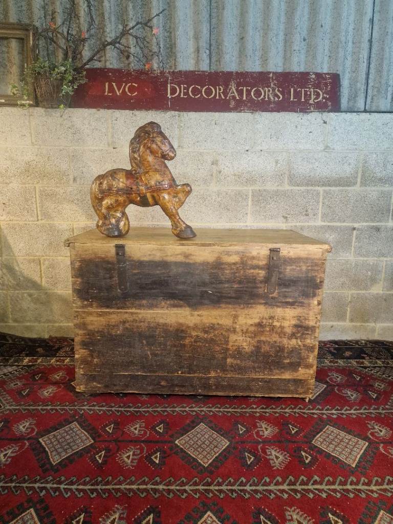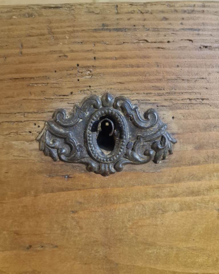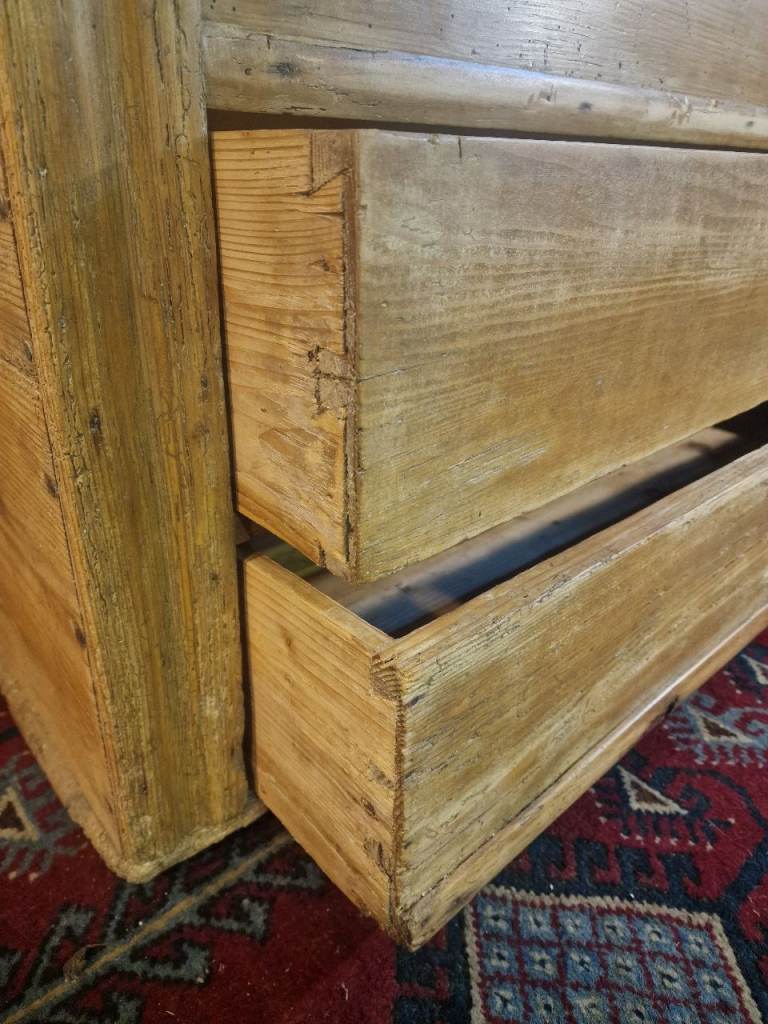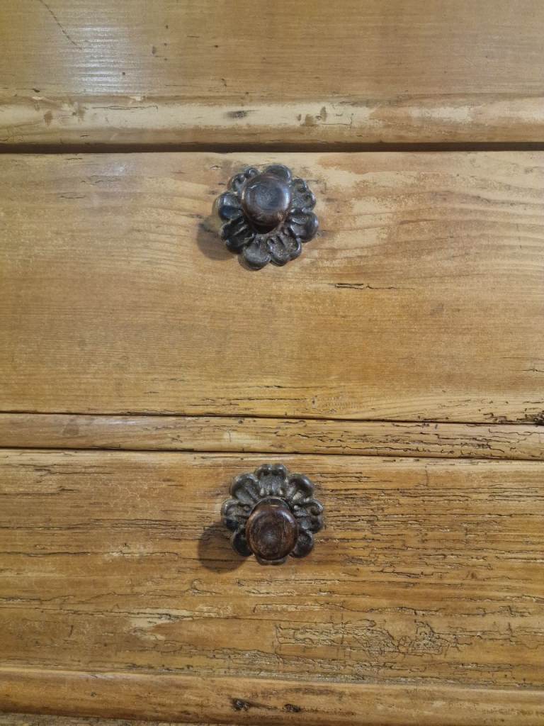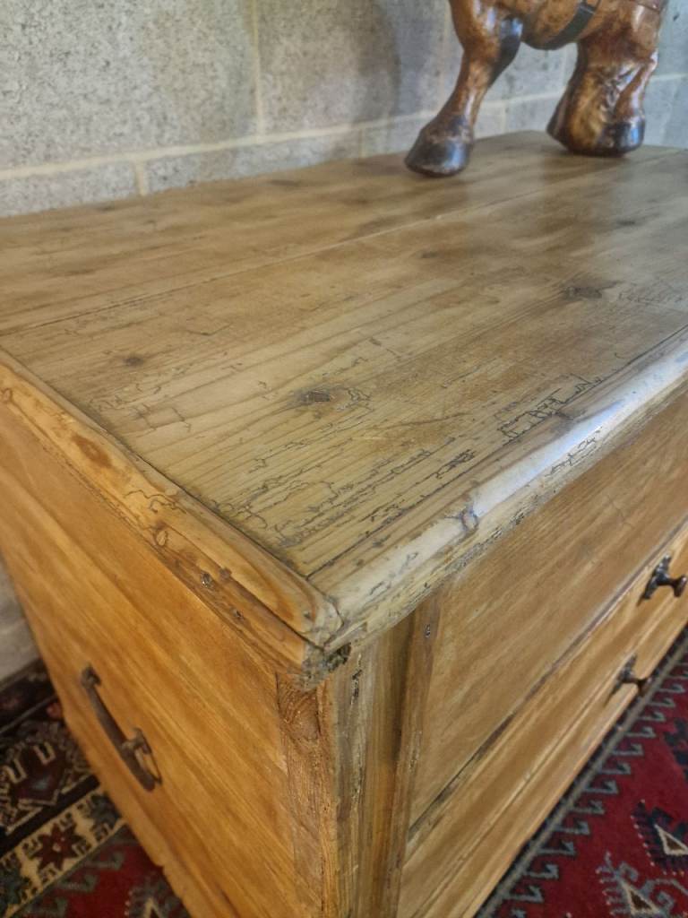 The plank-top lid opens smoothly to reveal generous internal storage—ideal for blankets, linens, or household essentials—while the fitted candle box provides a lovely nod to its period origins. The two full-width lower drawers glide well and are dressed with later but sympathetic metal rosette pulls. The chest sits square and sturdy, retaining the authentic marks, wear, and patina that make true antique pine so sought after.