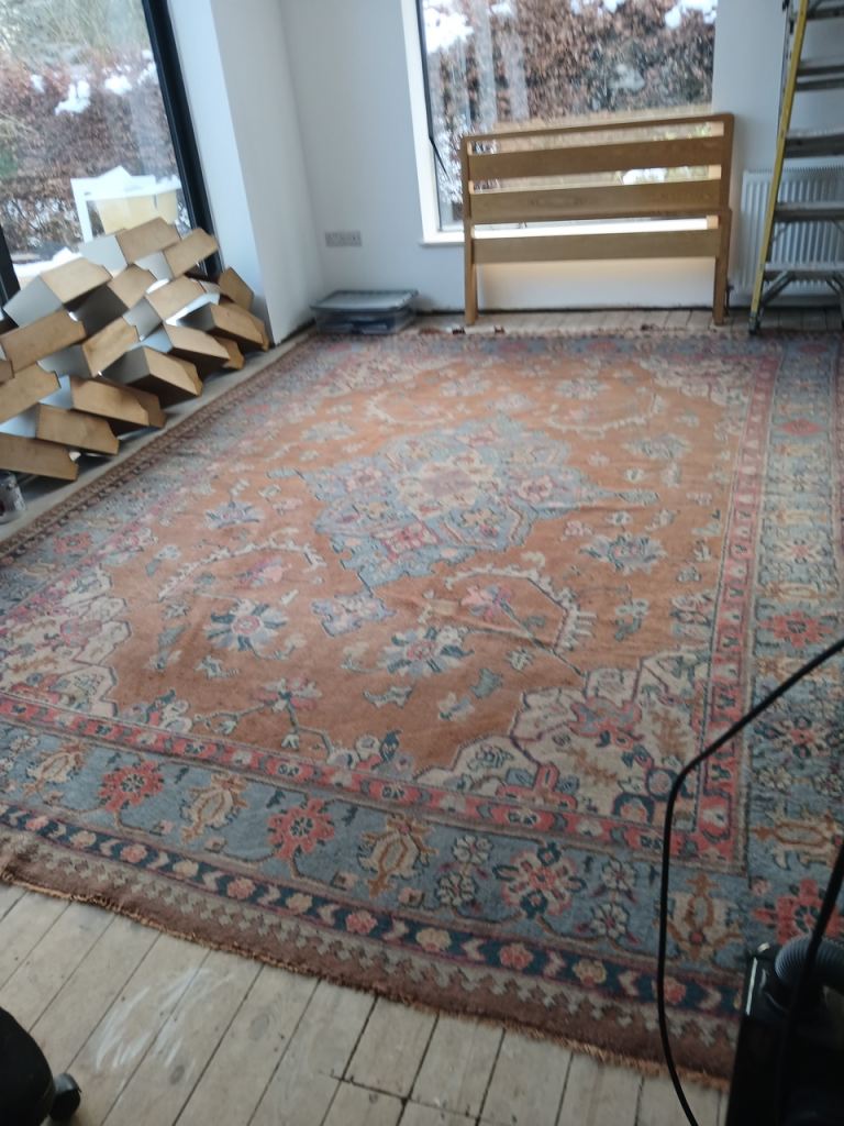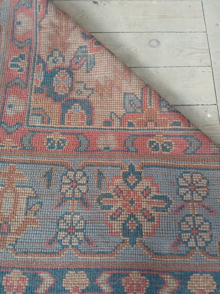 This 100 (approx) year old rug, bought from an antiques shop in Barnard Castle, measures 390 x 304m and is in great condition and a lovely rose, pale blue, oatmeal colour mix.