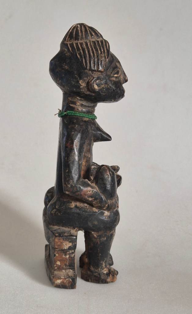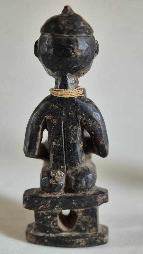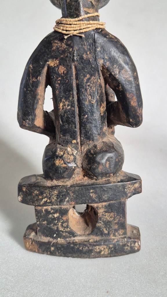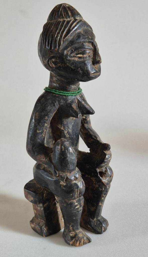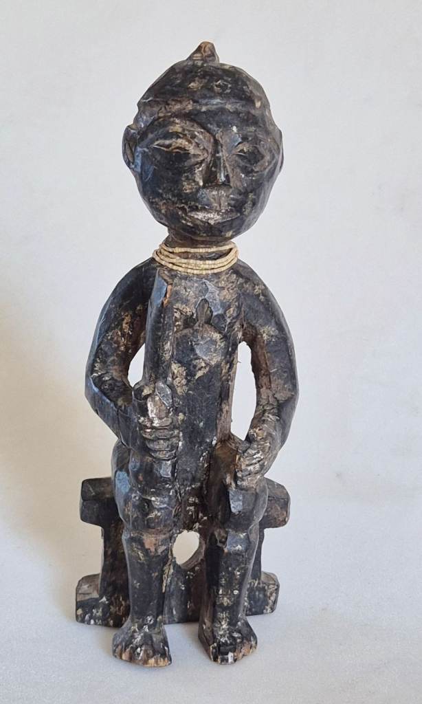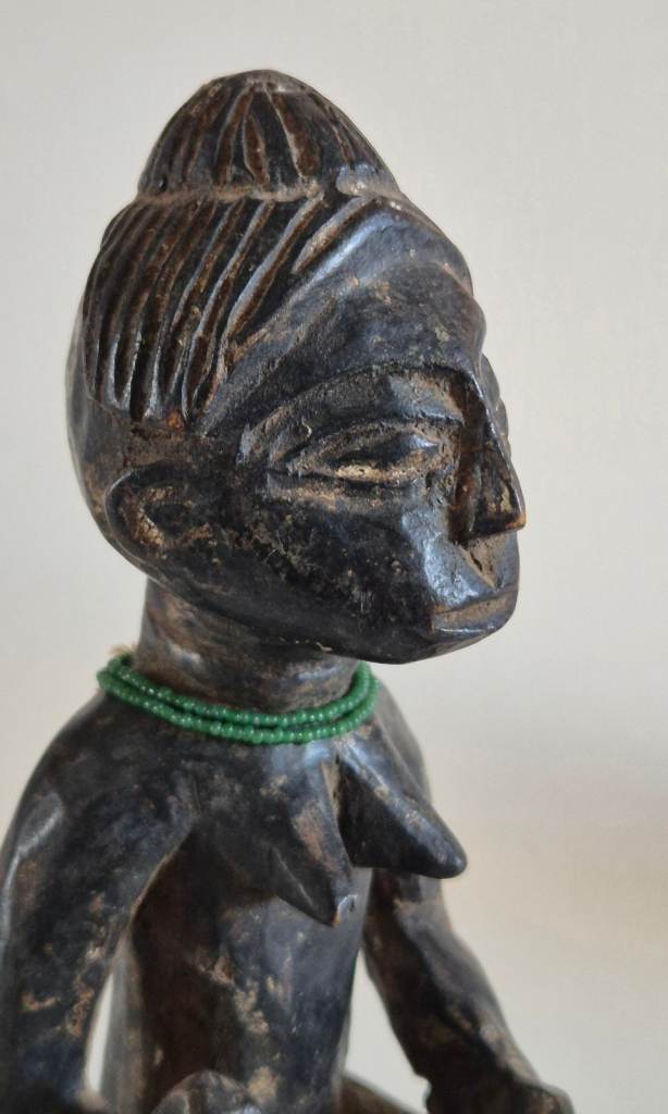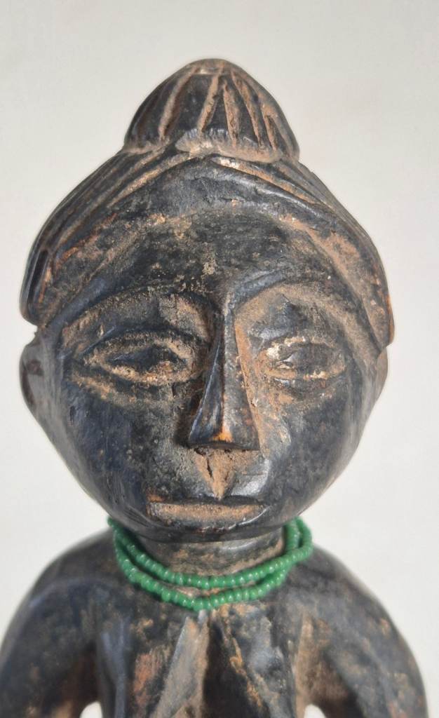 They are both seated on Ashanti stools, or Sika Dwa in Twi. The king holds an Akrafena sword in his right hand. He wears a ceremonial cap and has a sting of tiny white beads around his neck. The Queen carries a large fruit in her right hand symbolising fertility. She has a necklace of tiny green beads around her neck. They have been finely carved from wood and have a patina of age and handling.